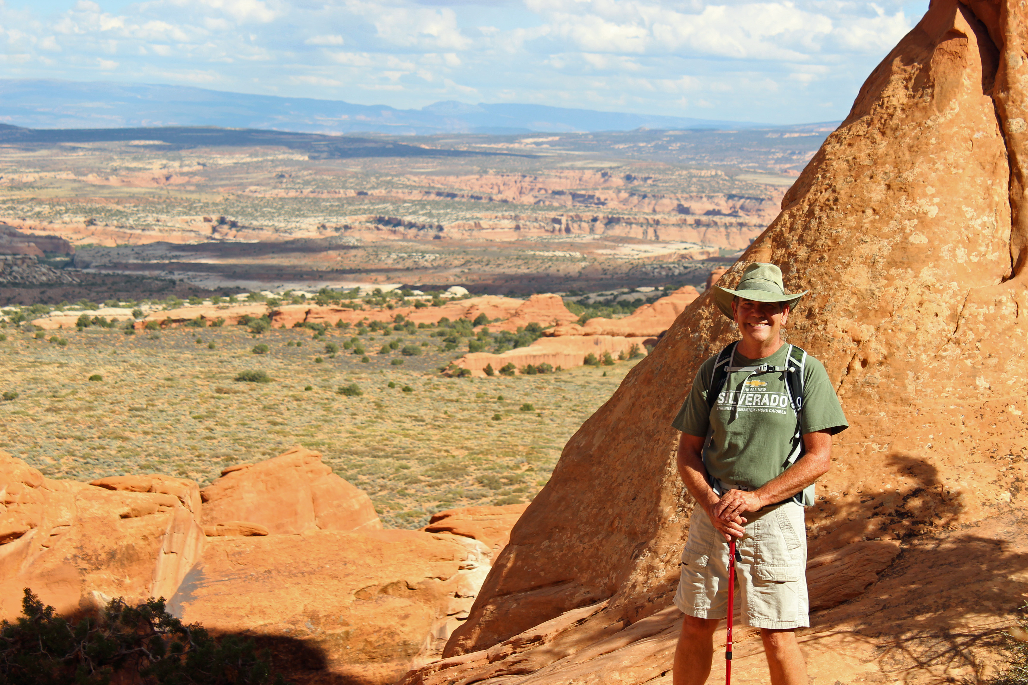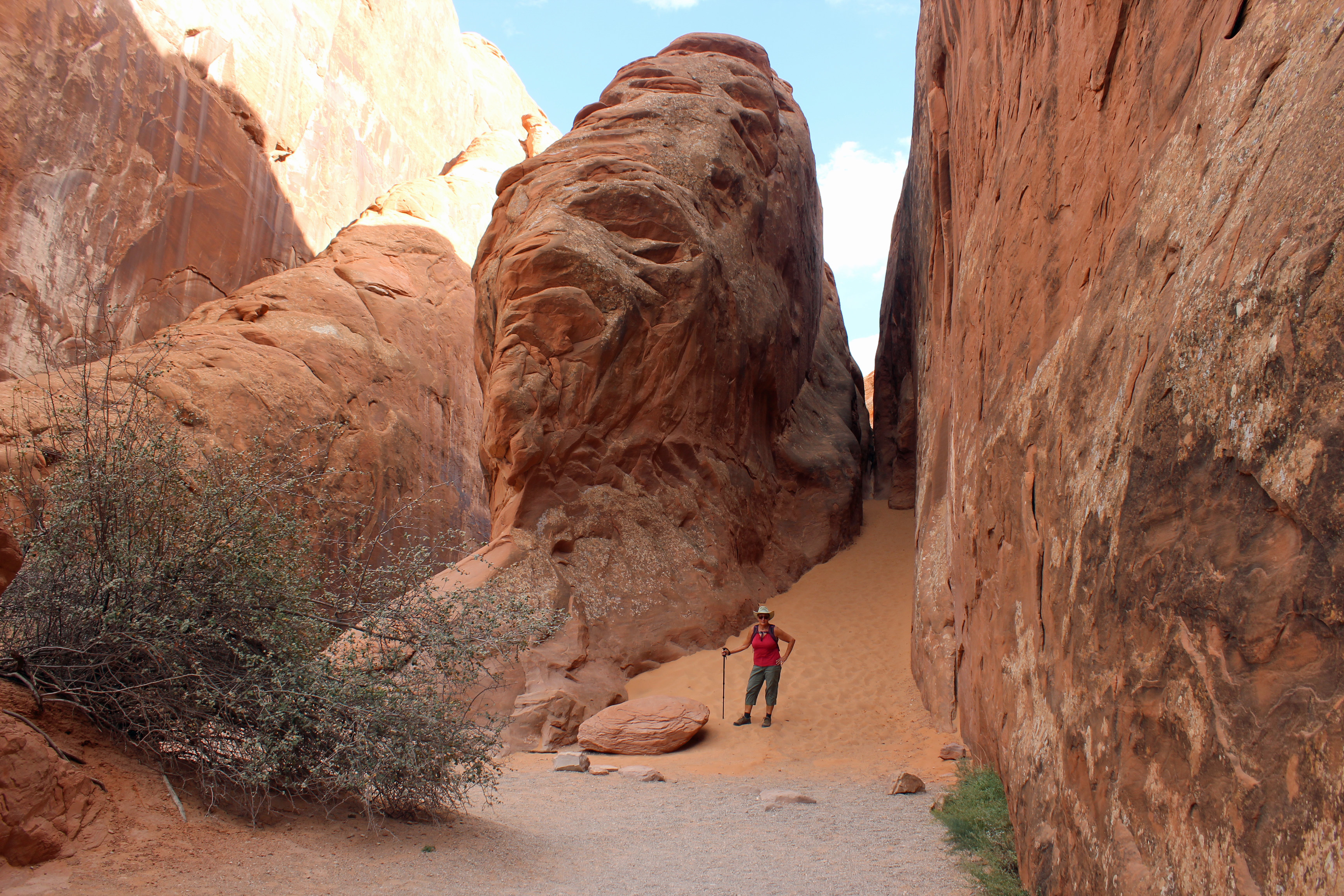 Now let me caution you about the National Park Service and their math skills. I don’t think they know how to measure distances. The trip to Delicate Arch viewing was supposed to be 100 yards roundtrip … no way. The trip into Devil’s Garden was supposed to be about 1.9 miles to the arch we saw, but Jackie’s phone tracked 8 miles round trip. And today’s trek to Delicate Arch trail, listed as 3 miles round trip? We both tracked that at over 4 miles without actually making it all the way to the arch. Not sure how they figure it, but count on it being farther than you expect.