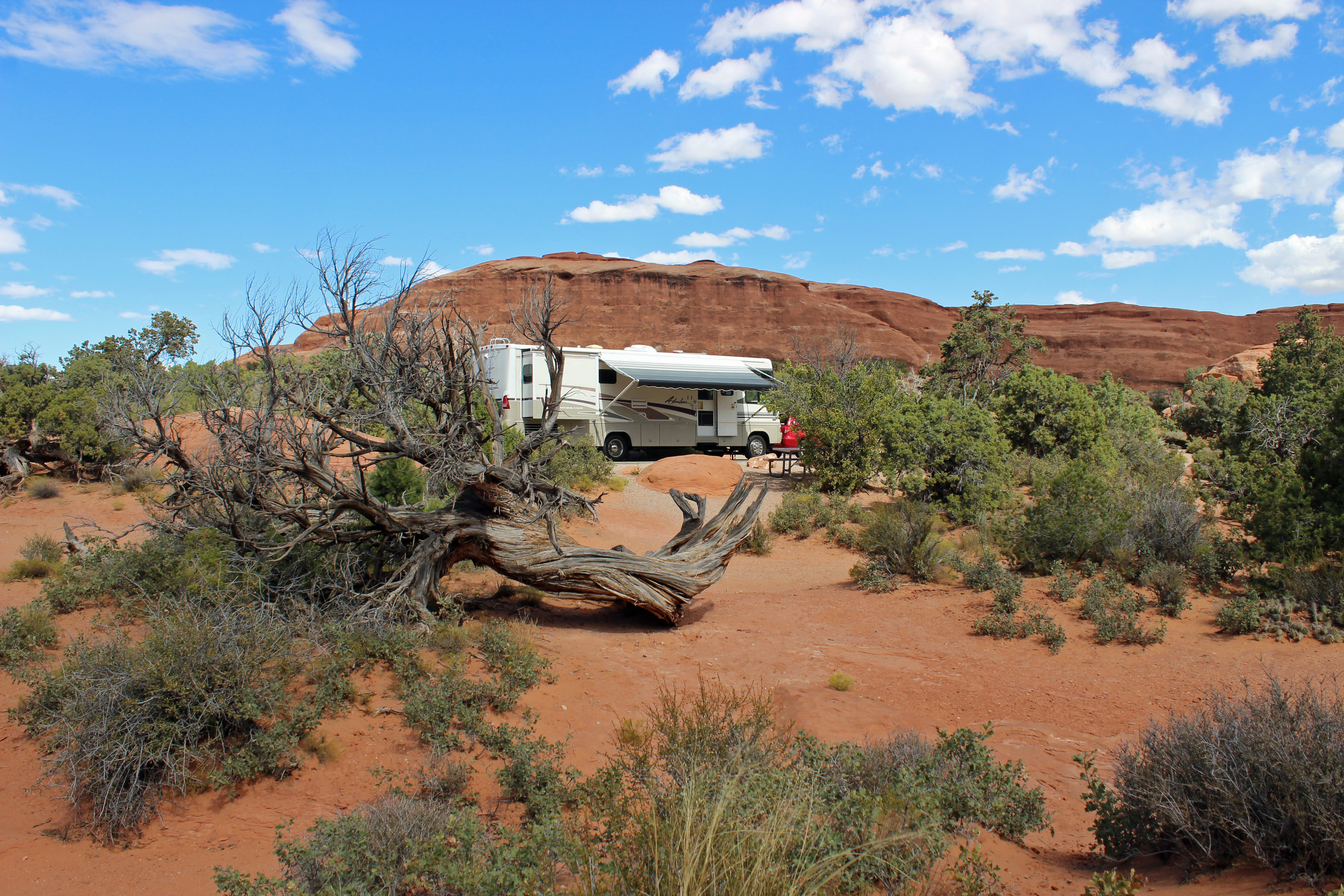 We pulled in to the campground, unhooked the car and drove to the campsite. Had to unhook the tow dolly to back in to the site, but it is fantastic. There are only 50 sites here, so each has plenty of space around it, with junipers, sagebrush and boulders, with a backdrop of red sandstone surrounding most sites. So cool. I guess if you could camp on Mars it would look something like this, minus the vegetation.