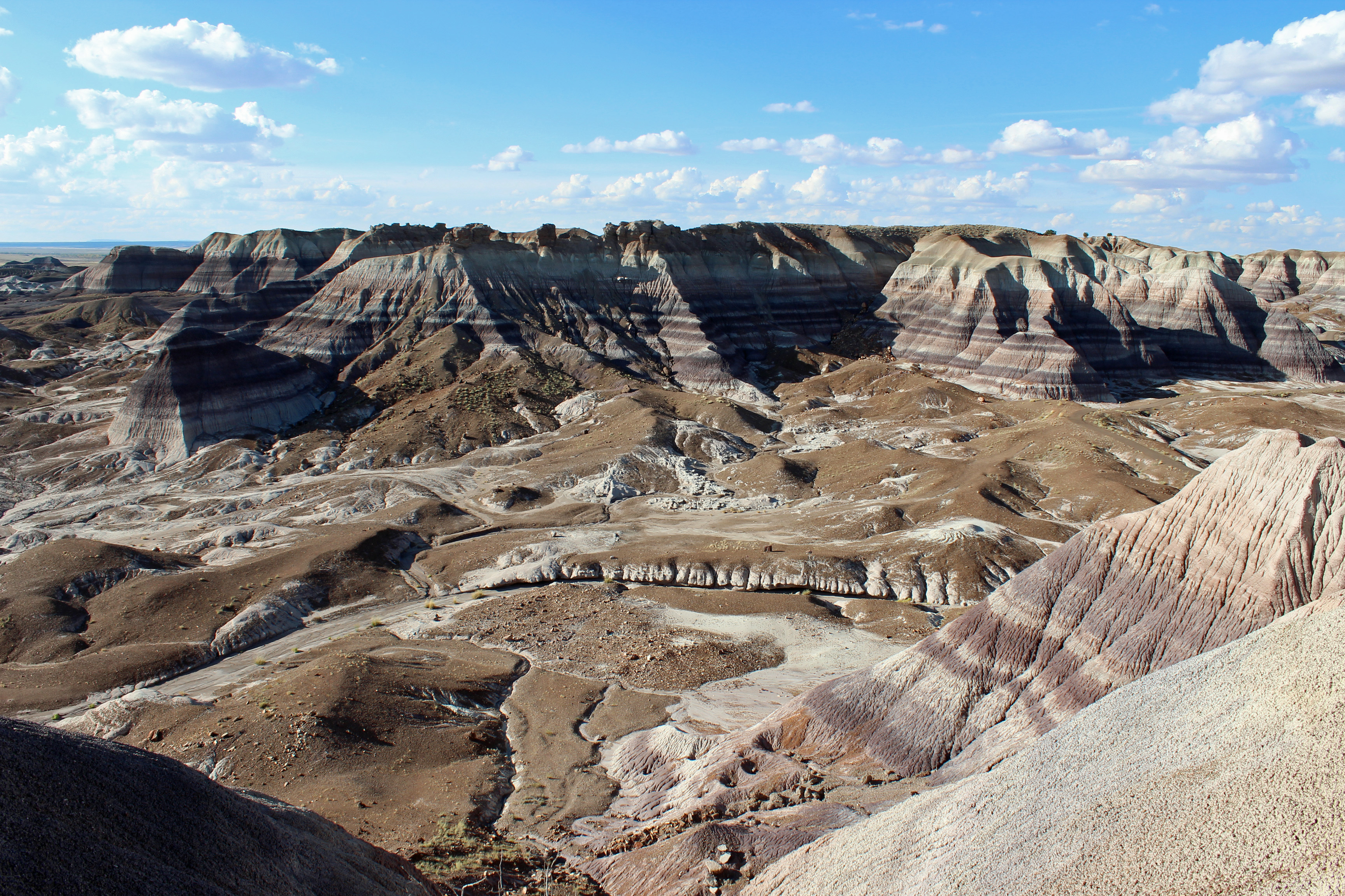 Back to the sightseeing. Since we were only in Holbrook overnight, we hopped in the car and headed for the Petrified Forest National Park. This was about 2pm. The park is a combination of Painted Desert at the north and Petrified Forest at the south. You exit I-40 and make one big drive through the park – 28 miles. Now the park was already about 21 miles from camp, so this was going to be a quick one if we were going to make it all the way through, north to south, and back another 20 miles to camp. Here is how to do the Petrified Forest on a time crunch: Jump out at the first overlook, “ooh, aah” snap the shot of the painted desert, jump back into car and drive to the next. For some overlooks the car stayed running… but we got the shot.