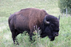 Plenty of prairie dog villages, but no bison. Hmmm, cars stopped ahead, woah …. look at the shoulder of the road there is a bison and calf and … yikes! Suddenly we were in the middle of the herd.