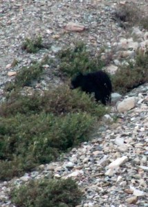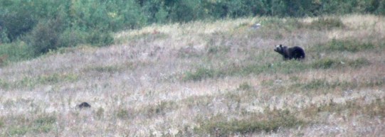 Early evening is planned to bear-watch at Two Dog Flats. After a camp meal of grilled strip steak, baked potato and grilled zucchini we drove to the flats and stopped next to another couple of cars to see what was out and about. No bear, but some elk were moving down the hillside. Two nice bull elk with big racks and several females with youngsters. Someone shouted from a passing car that grizzlies were spotted at the next overlook, so we all moved to that spot to see. Sure enough we spotted a grizzly and her cub moving through the field, pausing at bushes for a bit and then disappearing into the trees.