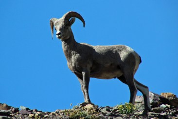 Back to the visitor’s center and up the Hidden Lake trail we went, to see the marmots again and catch some better pictures. Hard to describe how colorful the alpine meadow was – all purple and yellow and green. Wait, some folks spotted some bighorn sheep and we all stopped to gaze and take pictures. One male was headed up along the trail, so Doug headed him off and got some pictures that were almost fake. It was as if the sheep knew and posed for the shot.