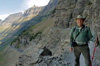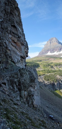 Day 4 brought beautiful clear skies, so we quickly got up, ran the generator, dressed and headed up to Logan Pass to see what we have missed in the fog of smoke. Amazing giant mountains surrounded us as we meandered along the blue St. Mary Lake and up the 3,000 feet to Logan Pass. An early start and already the lot was full. Doug drove down the road to an overlook parking area and caught up with Jackie at the visitor’s center. We started out on a new trail, the Highline Trail, which runs 20 miles to the US/Canadian border. Since we forgot our passports we decided not to make the entire trek, but did hike along a breathtaking cliff cut that was waaaay above the roadway below.