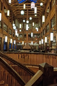 We hurried to the car and down to another impressive sight: Many Glacier Hotel. Sitting on the edge of the lake, this turn-of-the-century hotel has undergone a big renovation. I was particularly interested in the newly restored double-helix wooden stairway. We gazed out at the lake and mountains from the hotel deck and felt like it was indeed a magical day.