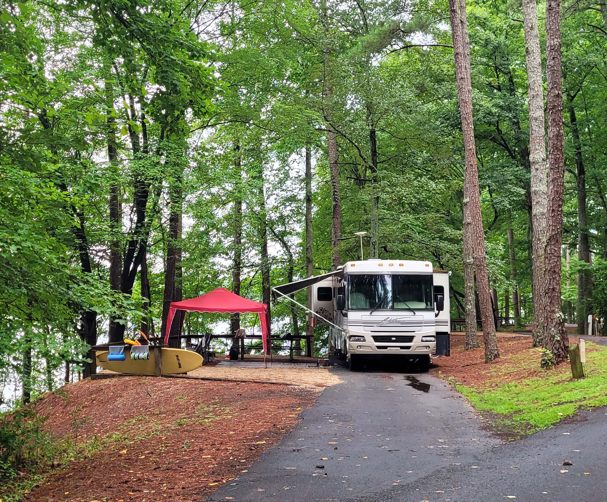 We were staying through the weekend, planning to pack up and head out Monday morning, and that worked out just fine. We floated around in the water, paddled around and just enjoyed ourselves. But of course on Saturday night as I was set to grill a steak, I waited a bit too late and a storm rumbled up and I was grilling in the rain. And of course the morning we were packing up everything was kinda wet. Rugs, shoes, towels, awnings. But things dry and a hot shower awaits back home (although I did have one really nice shower in the RV). With the paddleboards and kayak, Jackie headed home. I dumped the tanks and followed with the dog and cat as passengers.