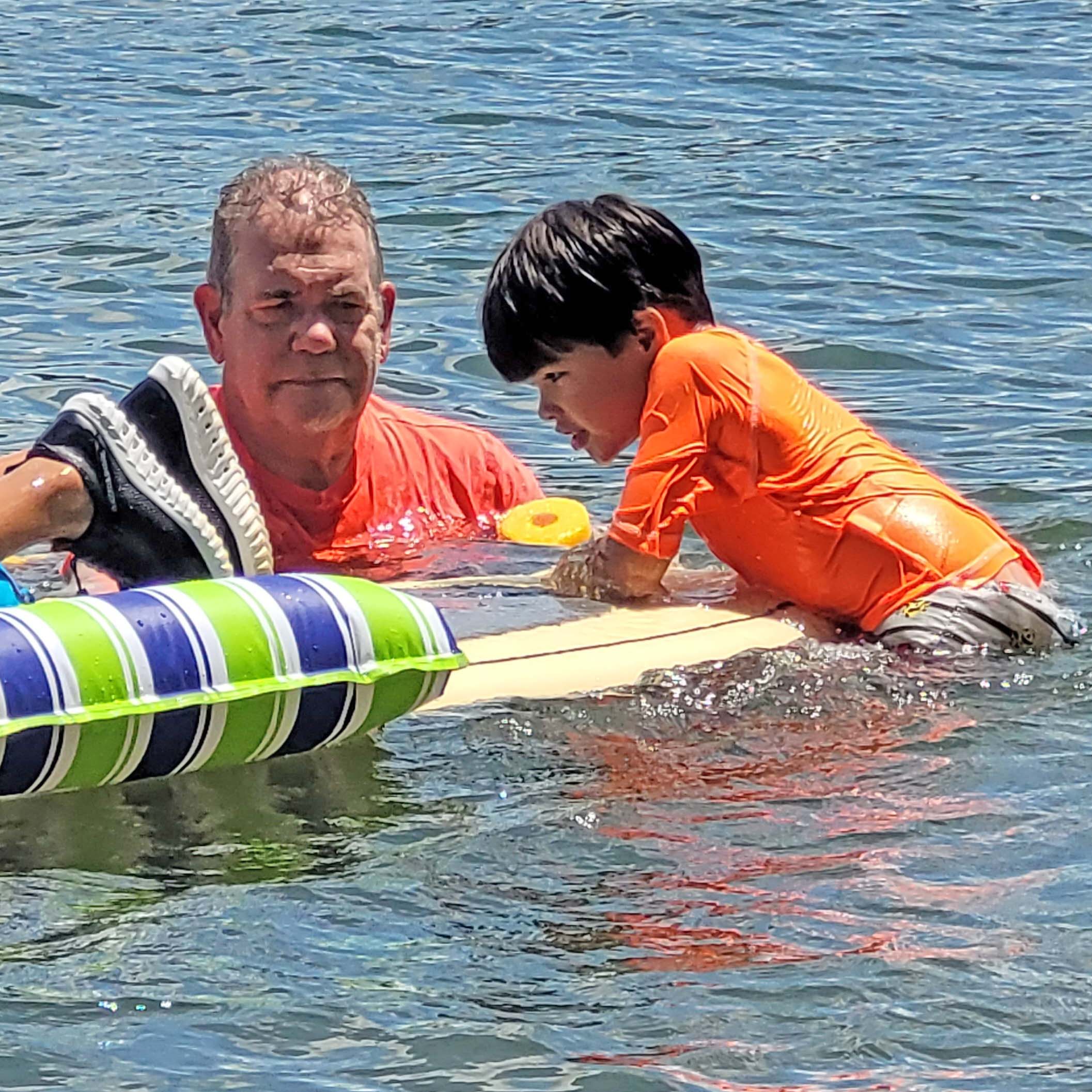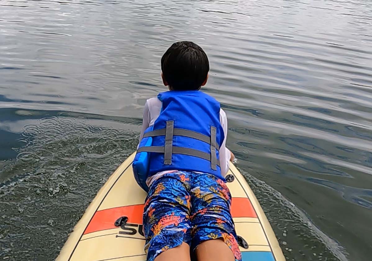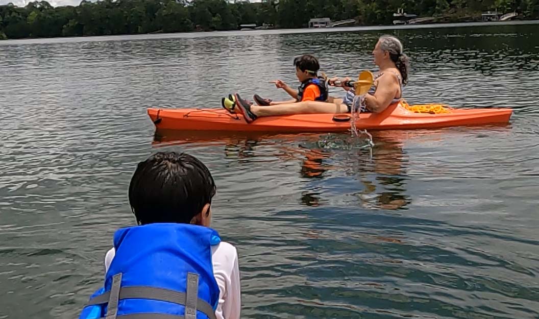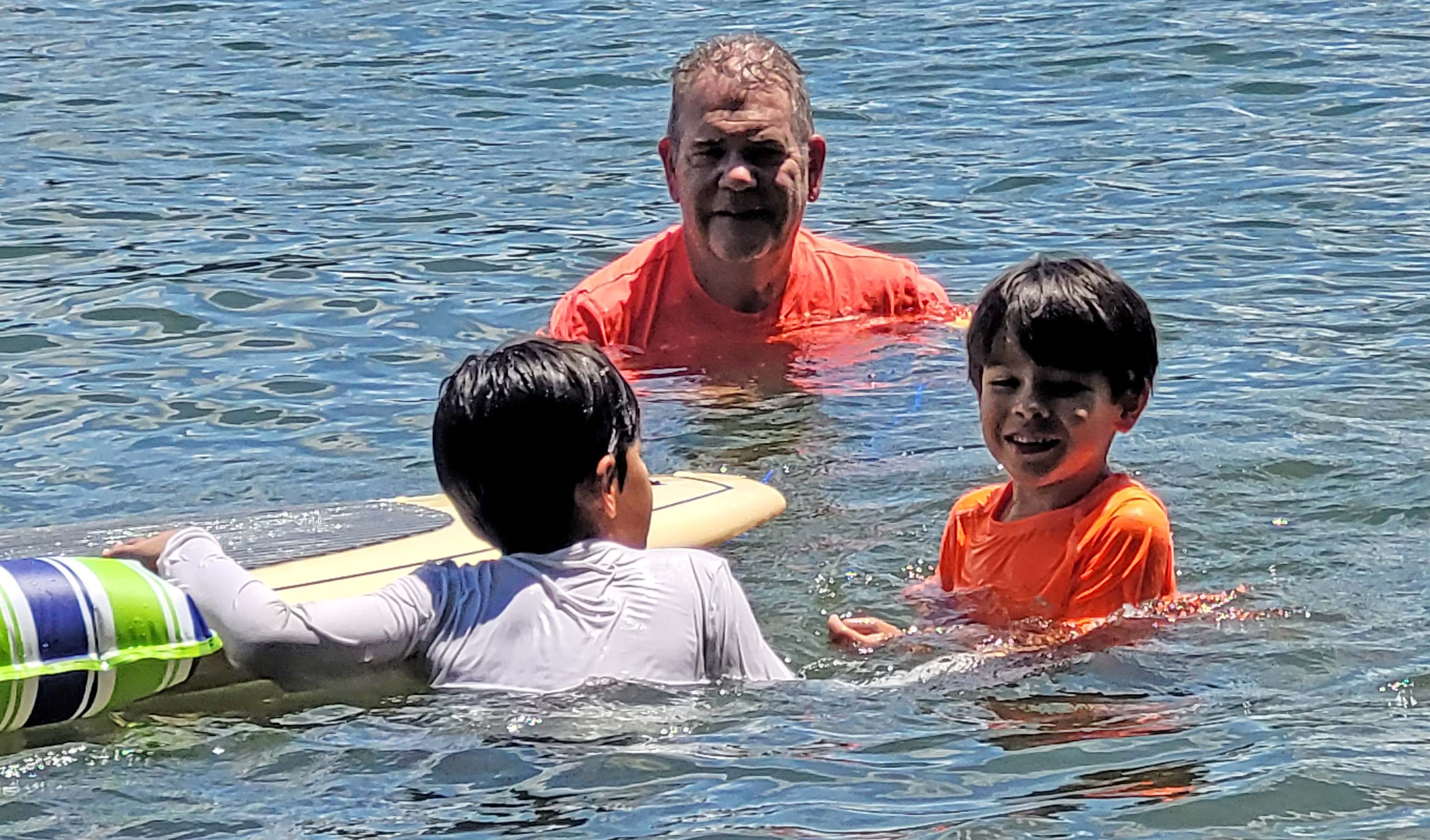 After breakfast the next day, a short walk with the dog for a garbage run and walkabout, and we all were back in the water. Much more climbing and jumping off the paddleboards and a nice final trip along the shoreline with both boys on my paddleboard. Wyatt checked on his snail shells, which he had put in a plastic bag overnight. You probably know the result: major stink in the morning and the shells were returned to the shoreline. Except maybe a few made it back home . . . ?