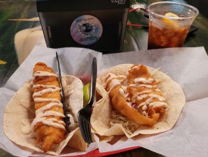 We were determined to enjoy the local food scene, so had dinner at McConkey’s Jungle Shack. Back porch dining seemed pretty popular with the locals, although it was maybe 6 tables. The fried flounder we ordered was generous, nicely battered and cooked – tacos for me, fish and chips for Jackie – but was on the mild side. Needed some malt vinegar or something salty to perk it up.