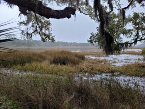After that brief visit we drove along the coastal marshes and over rivers that make up coastal South Carolina, from Beaufort to Edisto Island, just south of Charleston. Roadways with canopies of live oak and Spanish moss; small country churches and old post offices felt like a step back in time. The campground was pretty empty when we arrived mid-week, so it was pretty easy to park, level and set camp. Very reminiscent of Anastasia State Park in St. Augustine with the fern and moss covered trees and sandy ground. Even though it was in the 40’s and grey skies, we were set to enjoy the week and since it wasn’t actually raining yet, we unhooked the bikes and rode around. There are a lot of hard-packed sandy trails around the park, weaving through the woods, over marsh boardwalks and along the creeks. We were also close enough to bike to the beach and explore.