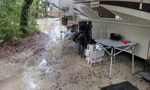 Maybe the most white-knuckled part was the road in and out of the park. When we first drove in I was surprised that we were driving down a sand road, not a dirt road, but a two-rut sandy track. I carefully kept moving down the half-mile long drive following along behind Jackie and was sure glad we weren’t towing the car on the tow-dolly behind us. But it got better – naturally we had an overnight thunderstorm the first night with rivers of water running through camp. When we decided to try a trip to town for wifi (and cell service) we felt ready to tackle the sandy road after watching a FEDEX semi driving in. Heck, if he could do it … but dang, it was a wild ride out and through the big puddles. Our RAV-4 did its best impression of a 4WD Jeep as we splashed up and down and swam and skidded along the track. It was just as bad coming back in and I just kept wondering how in the heck we were going to get our rig outta there. Again, I shudder to think what we would have done if we were towing the car.