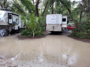 Rained all night with three tornado warnings for PCB vicinity and alarms about flash flood alerts. As we were having early morning coffee (on Wednesday) I suggested we get dressed just in case and sure enough we got another knock on the door to say they were evacuating the park and we needed to head out. That meant another scramble on ReserveAmerica to find availability somewhere well east of us this time. We booked a spot at Gilchrist Blue Springs State Park outside Gainesville, about 3 hours away. Drenching wind and rain this time as we pulled in the water and electric and hit the road. It was blinding rain driving on I-10 with the wipers on high and trucks throwing up spray and splash. We decided for this trip not to tow the car, which now meant Jackie was doing a lot more driving, but it sure made departure much quicker without having to hook up the tow dolly and ramp the car onto the trailer.