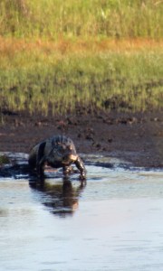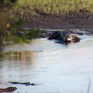 I spotted some spoonbills in the marsh one morning on my way to the beach, but I only had my phone to snap the shot – not my best shot. Spoonbills have been an elusive bird to get on camera for me, so this was something of a catch at least. I figured I could find them again the next day, but was treated instead to a turf war between gators. While snapping shots of one alligator in the marsh, a second male came lumbering in and quickly dispatched the other one out, watching to be sure he got the message, his tail flipping back and forth. You might be surprised at how quickly these boys can move!