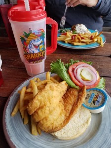 Took our “refill” mugs to dinner at Sharky’s and had frozen daiquiris with our meal of Mahi tuna tacos
