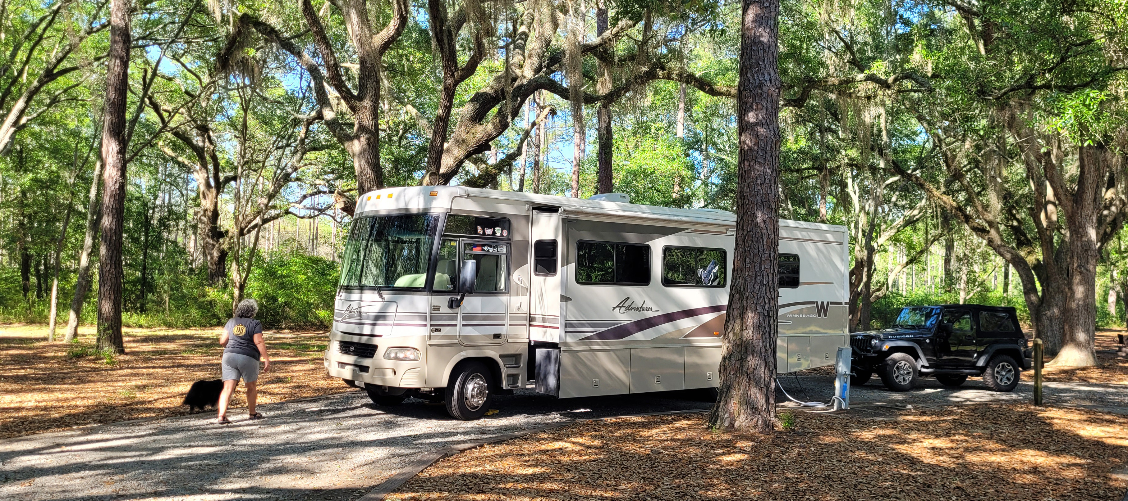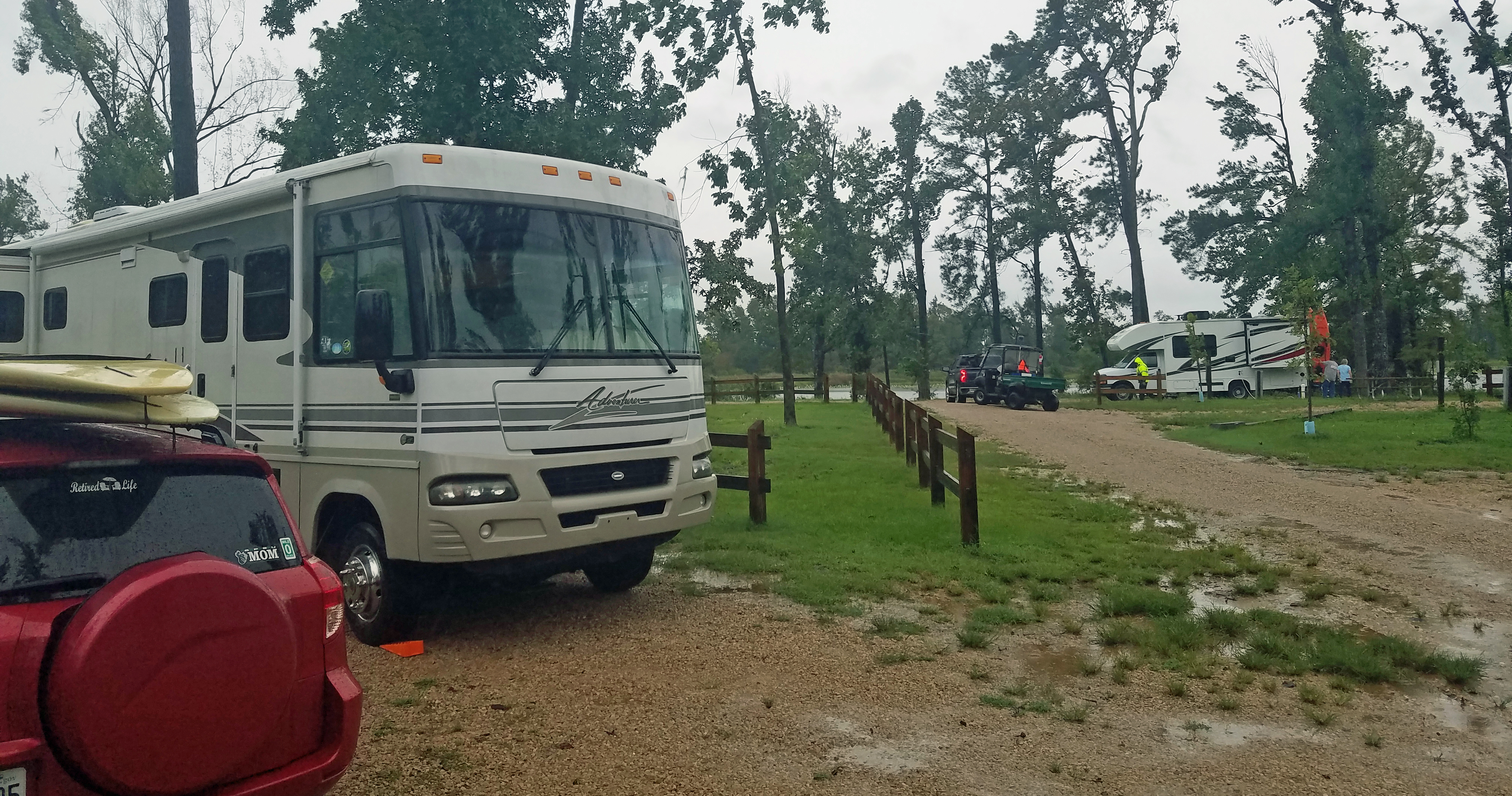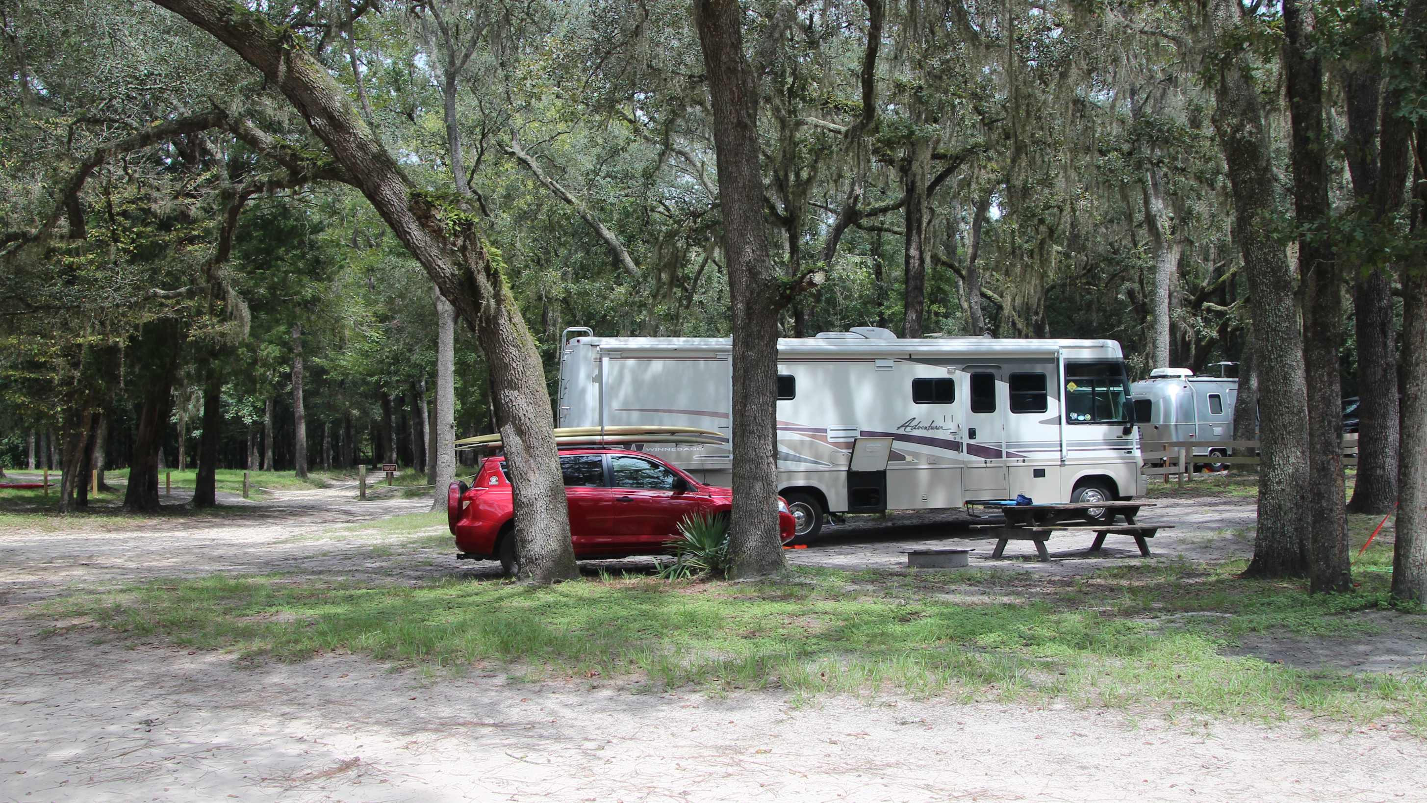 Rained all night with three tornado warnings for PCB vicinity and alarms about flash flood alerts. As we were having early morning coffee (on Wednesday) I suggested we get dressed just in case and sure enough we got another knock on the door to say they were evacuating the park and we needed to head out. That meant another scramble on ReserveAmerica to find availability somewhere well east of us this time. We booked a spot at Gilchrist Blue Springs State Park outside Gainesville, about 3 hours away. Drenching wind and rain this time as we pulled in the water and electric and hit the road. It was blinding rain driving on I-10 with the wipers on high and trucks throwing up spray and splash. We decided for this trip not to tow the car, which now meant Jackie was doing a lot more driving, but it sure made departure much quicker without having to hook up the tow dolly and ramp the car onto the trailer.