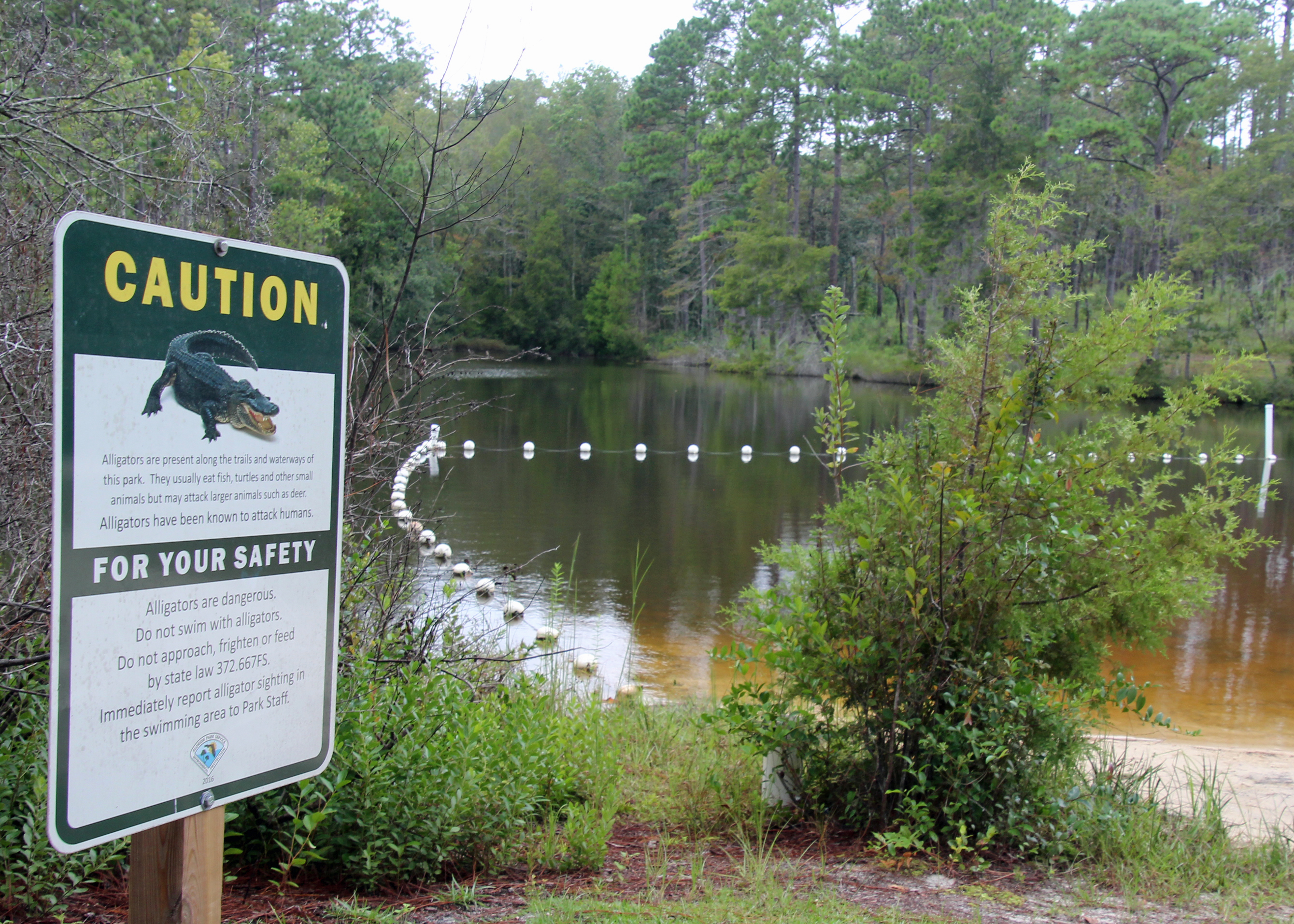 But before all that we took a short hike to the waterfall and sinkholes at the park. The tallest waterfall in Florida (75’) is certainly different, as it spills into a deep cylindrical sinkhole of limestone. Pretty cool. Upstream there was a small lake that was open for swimming. However, as you can see from the swimming area, there was a mixed message – swim, but please avoid the gators.