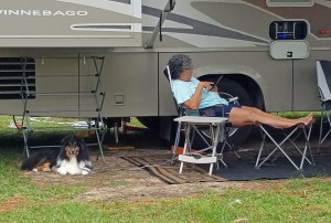 Maybe the most white-knuckled part was the road in and out of the park. When we first drove in I was surprised that we were driving down a sand road, not a dirt road, but a two-rut sandy track. I carefully kept moving down the half-mile long drive following along behind Jackie and was sure glad we weren’t towing the car on the tow-dolly behind us. But it got better – naturally we had an overnight thunderstorm the first night with rivers of water running through camp. When we decided to try a trip to town for wifi (and cell service) we felt ready to tackle the sandy road after watching a FEDEX semi driving in. Heck, if he could do it … but dang, it was a wild ride out and through the big puddles. Our RAV-4 did its best impression of a 4WD Jeep as we splashed up and down and swam and skidded along the track. It was just as bad coming back in and I just kept wondering how in the heck we were going to get our rig outta there. Again, I shudder to think what we would have done if we were towing the car.