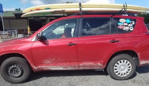 Oh yuck! What a discovery. As we got to the Jeep something looked very wrong. The spare tire and in fact the entire rear end of the Jeep was covered in splat. What?? OMG we were “splashed” by one big bird, no doubt a heron flying overhead. It was inside the back, too. Covered the flippers, chairs … fishy, chalky icky. So we spent some time with the hose, rag and bucket cleaning it all out and putting up the top. Guess our topless time is over. Man, that was one healthy bird.