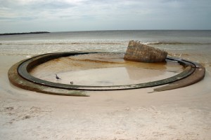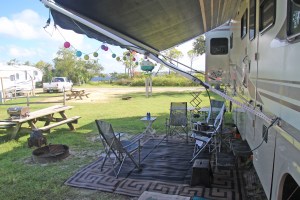 Our site was just fine – in fact it would be hard to complain about any of these sites in the newly rebuilt park. Level, clean, full hookups, water views – just not as many trees as before and missing a lot of the character that made this campground special. But it was a bit on the slim and narrow side, so when we finally got bikes, chairs, shelter, grill and picnic table all situated, we were kinda tight. The wind was pretty strong, gusting to 30 mph, and the air was long pants and sweatshirts kind of cold. Had to really secure the shelter, since it was almost airborne a few times. A few light showers came through the first two days and the Gulf was whipped up with huge waves and no swimming was permitted. It looked wild – more like a storm in the Atlantic.