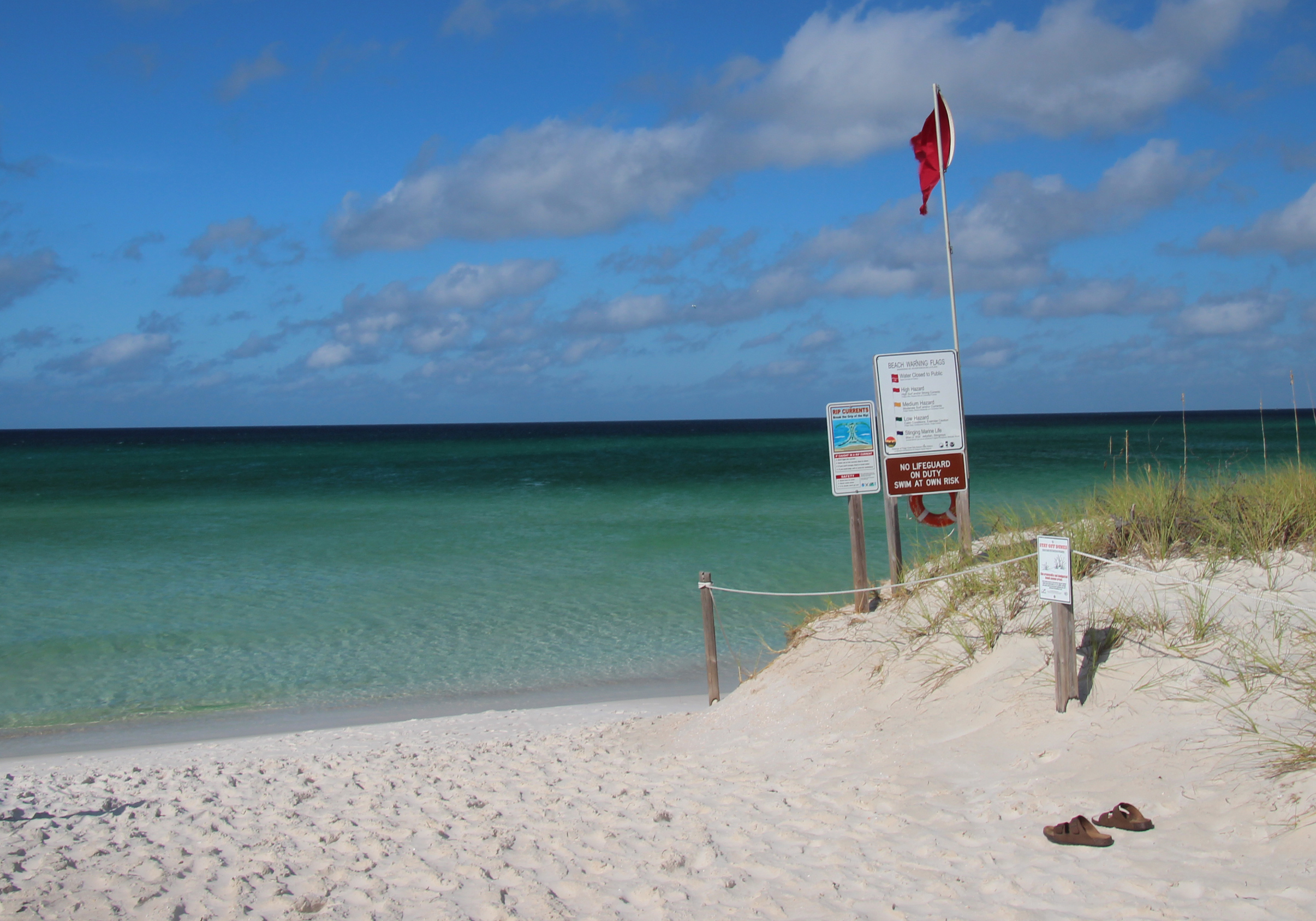 Also opted to unhook the bikes and ride along the beach road, looking for potential rental units for the future. By Monday, our last day here in PCB, it was still overcast, but at least the water was getting back to clear. Since our pass for St. Andrews was still valid we drove to the park to see what it was like.