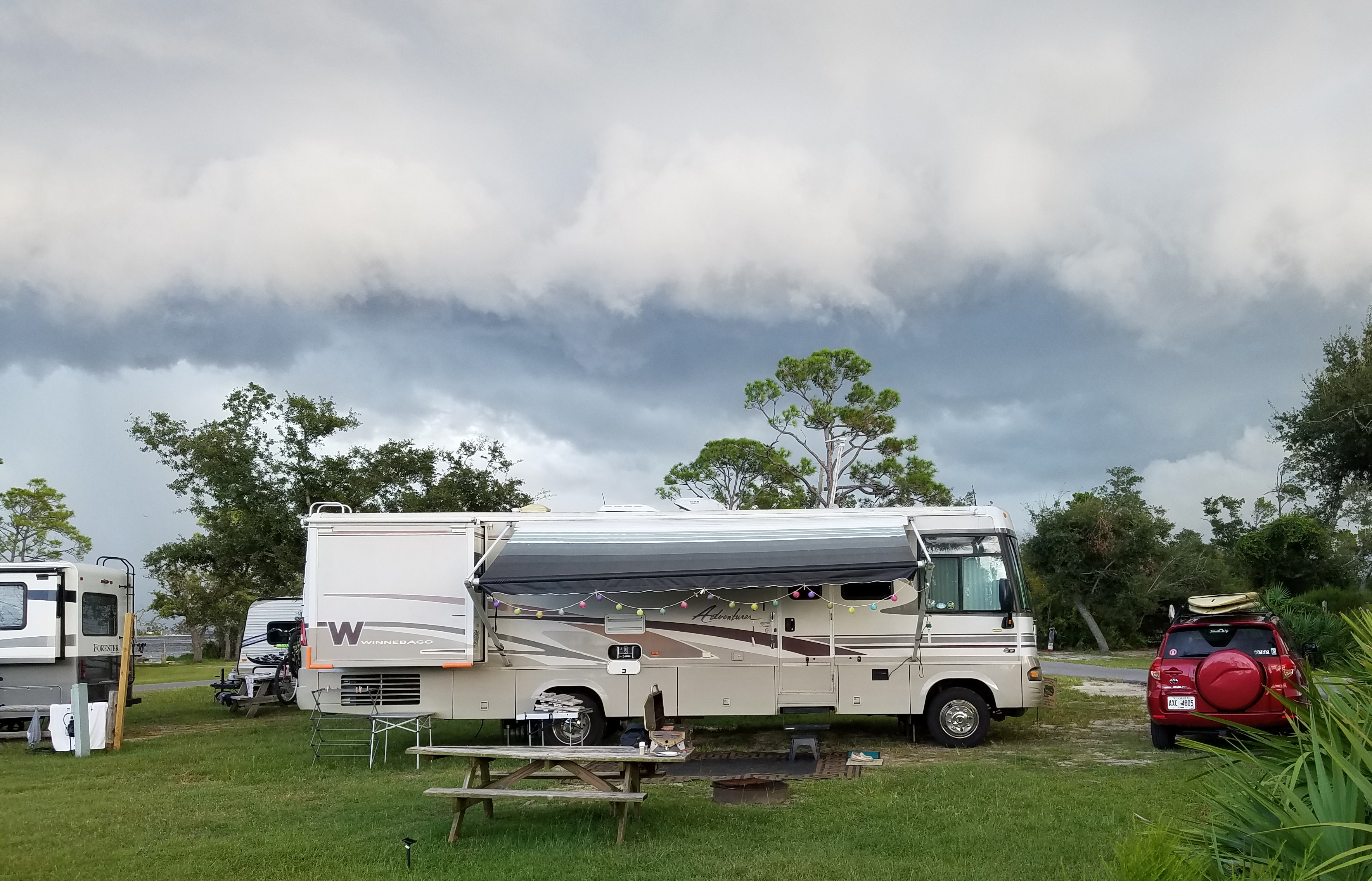 It is a rainy morning in the motorhome, in fact there is thunder rattling around the Grand Lagoon and the pelting rain is getting pretty loud in here, so it is a good time to sit and compose the latest blog of our current adventure. We have been camping at one of our favorite spots in Florida: St. Andrews State Park, Panama City Beach. There are several reasons why this visit has been special, the most important of which is that the campground is finally open again after all the damage and restoration from Hurricane Michael in 2018. You may recall that we were here that October when we were suddenly evacuated and spent the better part of a week camping around the panhandle of Florida as one-by-one each state park closed due to the storm. (You can search the blog for some of those posts).