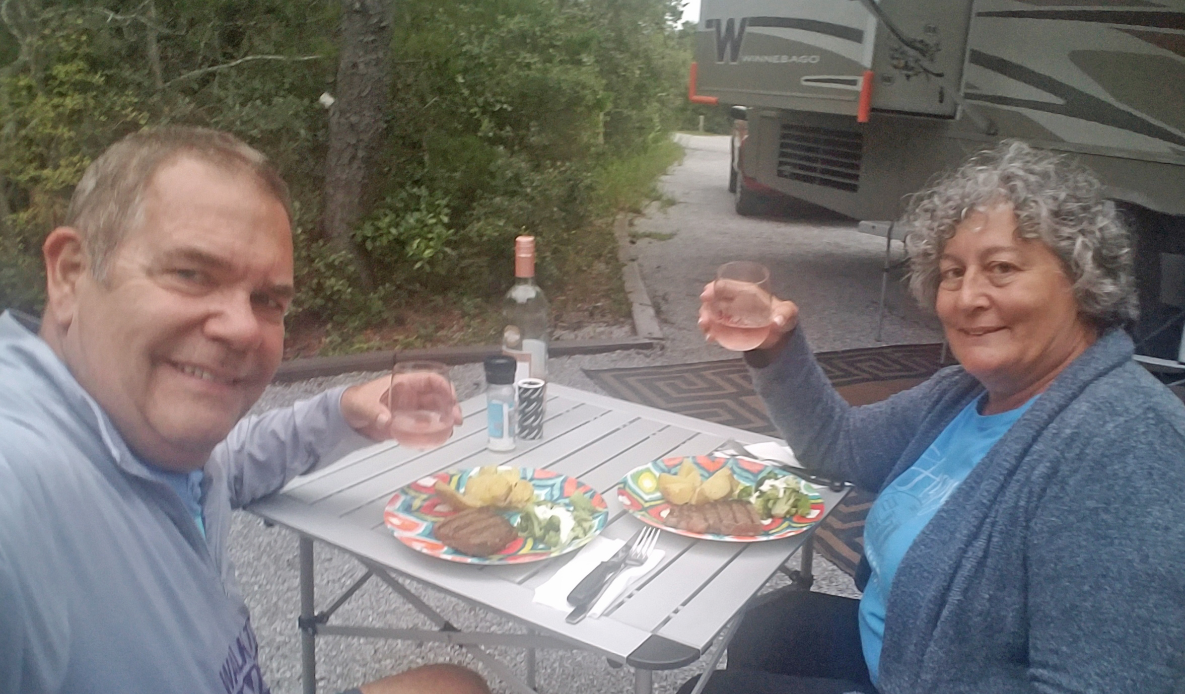 So we each arrived in stages – John stopped at our house a few days prior and we drove to Lakepoint State Park in Alabama for a night. We stopped in LaGrange to have lunch and a beer at Wild Leap Distilling – only to find out it was the finish line for a fundraising run. Pretty busy so we just ate lunch in the motorhome, then on to Eufaula for the night. We prefer to break up the 6-7 hour trip this way because, well, because we have the time to do it. So far so good. Next morning (Sunday) it was off to the beach for the week. But the rest of Tennessee was also on fall break, so once at the campground and beach it felt more like spring break than the middle of October. We zipped around on our new eBikes, which was really easy on the flat roads. But the best part is the beach and the water – absolutely clear, slightly cool water with gentle waves and wonderful white sand beaches.