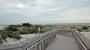 Racoon River was a good stay for 4 days, since it was just a block from the beach. And yes, we did see a couple of raccoons trekking across the road one evening. The weather started to cool down into the 60’s and 70’s and it continued to be pretty breezy and overcast, but we rode bikes and tried to get the best of our beach time. Within biking distance was the Shrimp Basket, so we ordered a take-out meal of fried fish to enjoy back at camp. Breaking camp was easy and the short drive to Destin meant we were settling in at Henderson Beach early in the day. There are only 60 campsites here, so you have a lot of privacy. It can feel like you are in the middle of a scrub pine woodland – until you hear music and voices from the club level of the condos that are barely 200 yards away. Even though we enjoyed a Saturday evening wedding reception from afar (“I present Mr. and Mrs. …”), it was a wonderful, spot and a generously large pull-through.