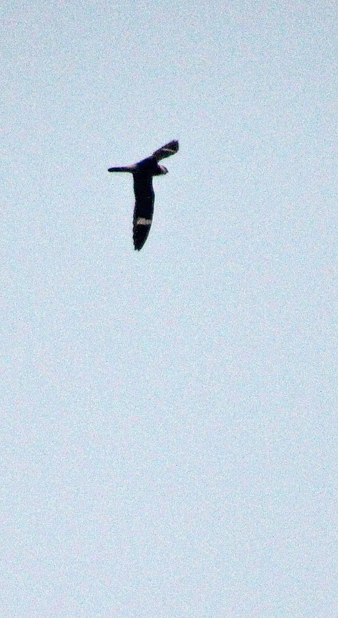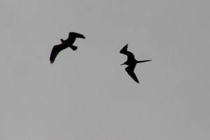 Walking Destin Harbor and spotting a frigate bird high above (joined by an osprey, for comparison)