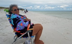 In the morning we started off on the bikes only to find Jackie’s rear tire was flat as a pancake. Gave it a good going-over but found no sharp objects or obvious leaks. Wouldn’t hold air though. A run to Walmart to get “green slime” to fill and fix the leak. Unscrewed the inner plug, added the green stuff and pumped in the air. No good, still went flat. Tried that twice and then gave up, went to the beach.