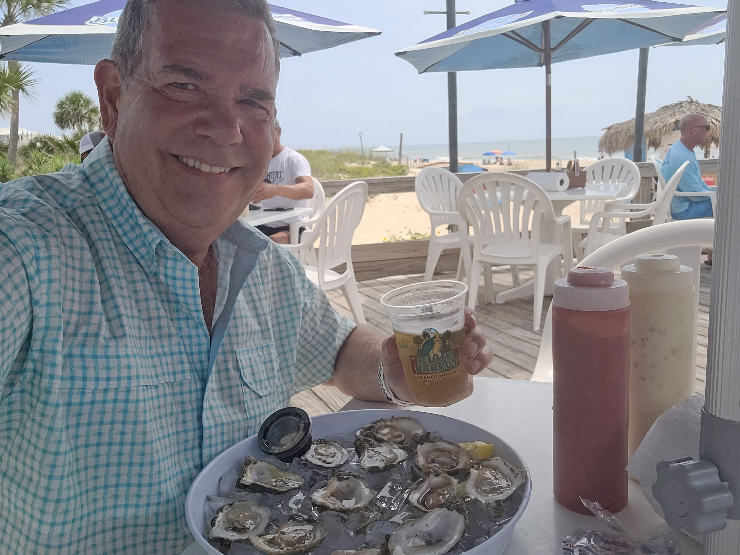 I just had to find a beachside bar and have a beer and raw oysters. The Blue Parrot is the perfect spot on the sand, actually the ONLY beach bar, and the plate of ice-cold, sweet oysters tasted too perfect with a pint of Oyster City beer. Cheers to you, Dad! I know he would have joined me if he could. Jackie had a basket of fried Grouper fingers that were tender and sweet. My, my, it is so rough to be retired!