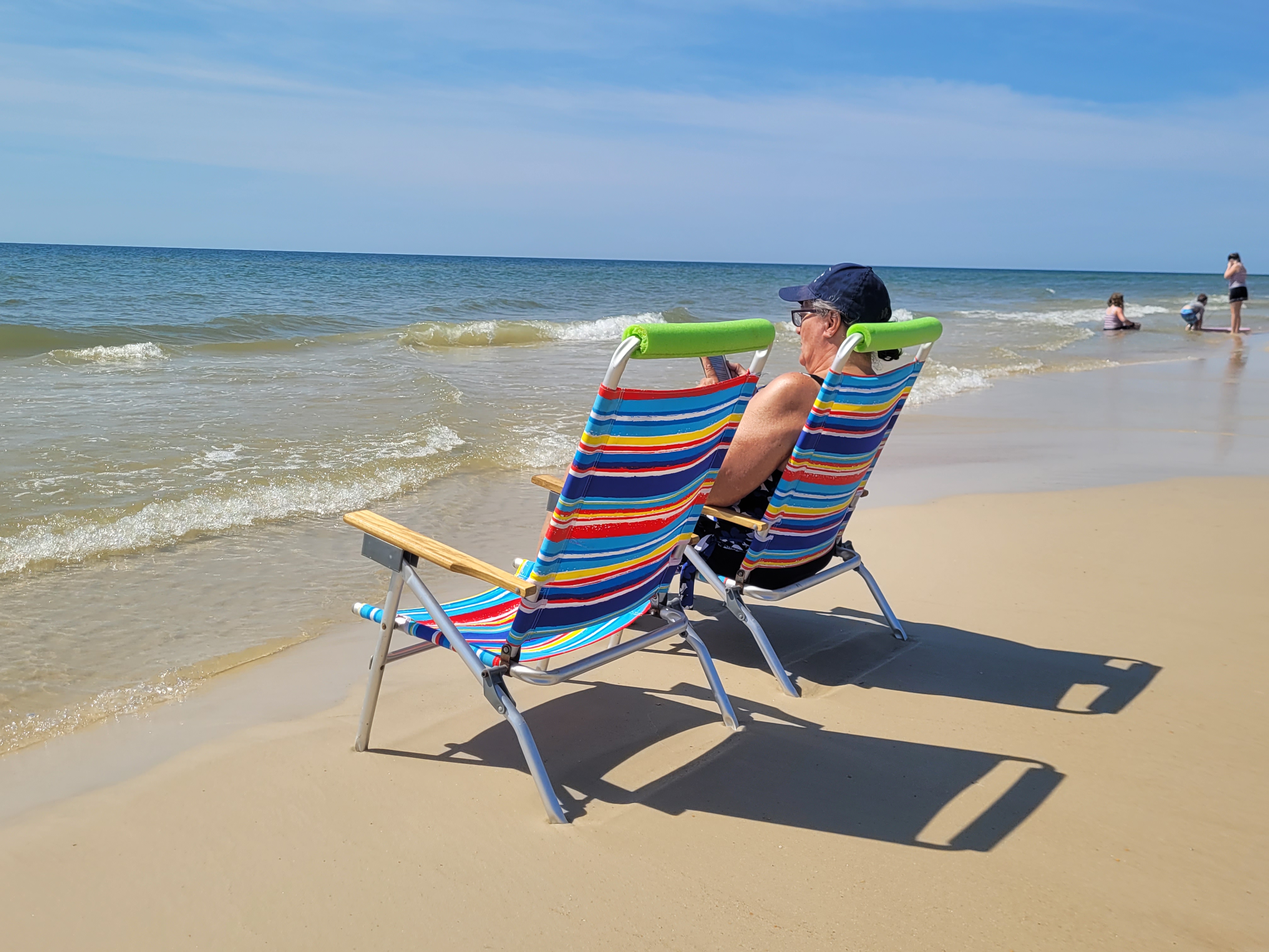 The beach has been renourished with sand pumped from the inlet, so it was filled with shell bits and was a very high dune hill, but with the repairs to the rock jetty and all the new sand, at least it looked more like the beach of the past. But it did make for a hike to and from the water’s edge with our well-used Tommy Bahama cart loaded with chairs, umbrellas and beach beer.