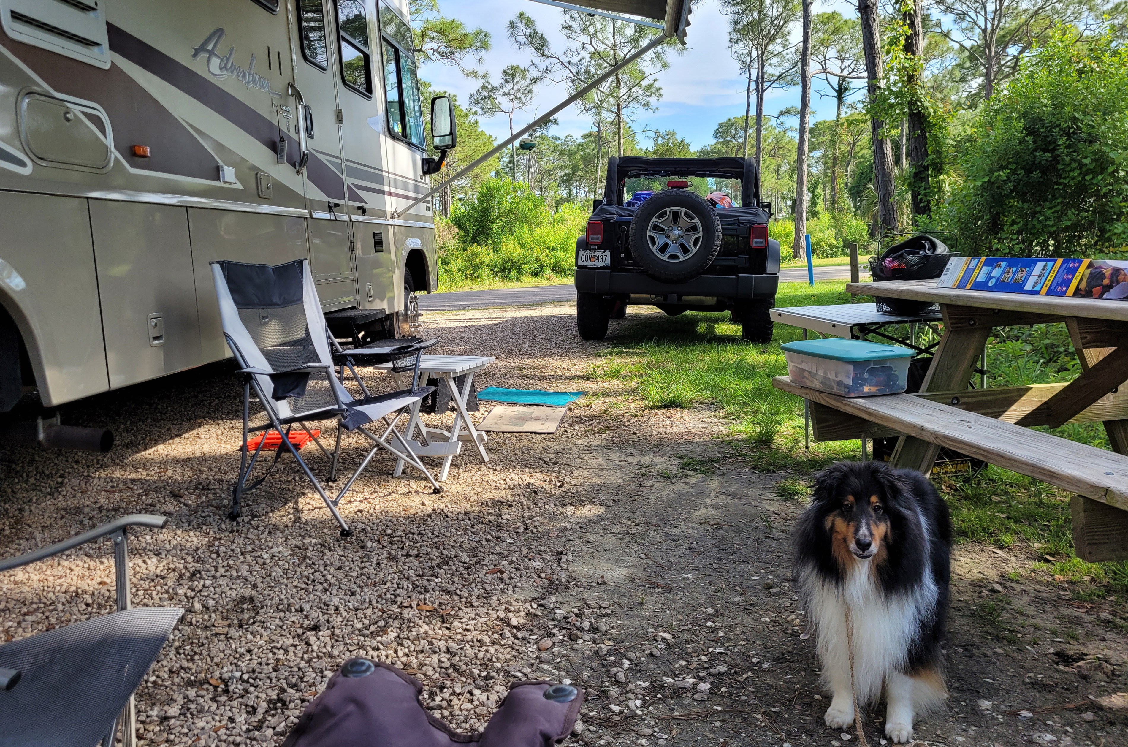 Off we went, with Binx (cat) and Kodi (dog), towing the Jeep and ready for beach fun. We usually break up the 7 hour trip by stopping halfway at Lakepoint Resort State Park in Eufaula, Alabama, but we were making such good time that Jackie got on the phone to look for options closer to PCB. As she was searching the Florida state parks it occurred to both of us that we were traveling just 2 days after St. Andrews reopened from the hurricane closure and maybe there would be availability. Well, in fact our reserved site was empty and we were told to “come on down” before 5 and check in. So we kind of got a bonus day, arriving by 4 and setting up camp.
