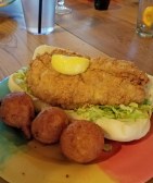Dinner was a great spot along the water in Pensacola, the Oar House, where we started with drinks on the patio but moved indoors when the sun went down and it got cold again.  The grouper po’ boy I had is a serious contender for best grouper sandwich.  This one was a monster slab of grouper on a bun with remoulade sauce and lettuce – a big mouthful for sure.  Judy had ahi tuna, Craig had shrimp and grits, Colin shared some of his fried oysters, which were very soft and tasty – everyone enjoyed the food. This place was fun and would be an ideal spot in warmer weather, with a big outside bar overlooking the marina.  Good choice.
