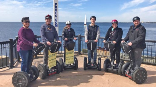 And, yes, we did just fine the six of us zipping behind our tour guide along the streets and sidewalks of downtown like a swarm of bees buzzing along.  However, about midway through the tour I got a little flummoxed and lost my balance forward just a bit.  If you know how Segways operate, you know that is the instruction to go faster, so zipppp I go forward a lot faster than intended.  I tried to dig in my heels to slow down, but meantime the curb came up fast and I was soon bouncing and spinning circles, dragging around the road.  Finally let go, got my foot untangled, dusted off my pride and we got going again.  Yep, I have a few brush burns on my knee, but otherwise lucky that was all.  Oh, but hotshot nephew Colin had an encounter with a bush that left him sprawled on the ground later, so it isn’t always smooth running on these “simple” scooters.  Emerald Coast Tours did a great job of showing us the historic district and we learned a lot (for instance, did you know Pensacola was the first colony in the New World – before Plymouth Rock and Jamestown?).  I was surprised to learn that Andrew Jackson was Florida’s first governor – wasn’t he a Tennessee native?
