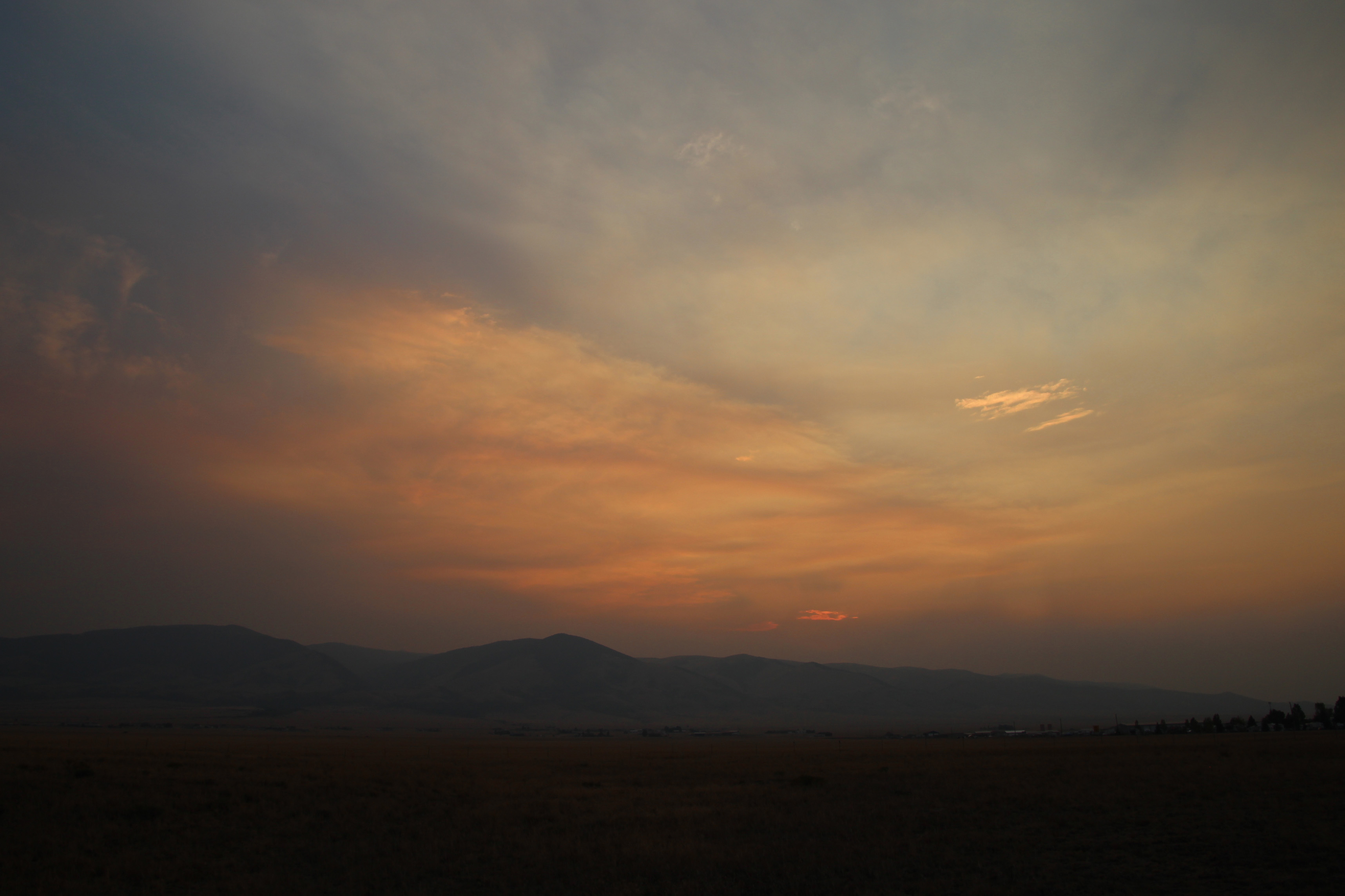 Nothing remarkable, but clearer skies with the smoke of western wildfires left behind. Next day as we got set to continue east, we noticed that we lost a hubcap on the car somewhere along the washboard gravel roads, dangit!