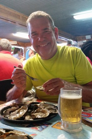 Next morning Jeff was pondering the whole question of a box of oysters to take home. “Dad’s gonna love them, but I don’t know if I want to drive around to Hunt’s to get them.” Those oysters were calling our name, so we decided to try the closer Treasure Island Seafood Market and bought 100 fresh oysters (hey, they were a good deal), piled in a box and filled with ice. Hmm, don’t have a clam knife in the van – guess we need to hit Winn Dixie. Oh, and what about that bloody Mary mix over there? Perfect! Back in camp it was time to shuck oysters (Jeff’s job) and serve up bloodys (Doug’s job). Ouch, that knife was sharp and the oyster was tight … well, 12 oysters and a bloody thumb later we had to rethink. 88 to go and “how exactly did they shuck those guys so quick?” Ah well, time to snorkel instead.