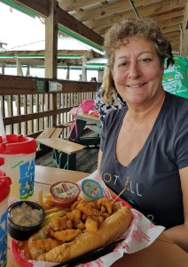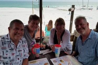 My brother Jeff and sister-in-law Vickie (you will recall them from our cruise posts) joined us for a few days and we had a total blast. Our mission was a search for the best oysters around, plus some good snorkeling. But first we had to hit our favorite beach bar Sharky’s for grouper sandwiches and drinks. It was as good as ever, with a table at the rail along the beach. So of course there is a bit of a story, too. Jeff ordered a frozen margarita and was asked “large or small?” Large of course, and it arrived in a big plastic beer stein with a lid. Okay then. I ordered a ‘Shark Attack’ for Jackie and I to split, large of course, and got the same plastic mug. Cool. Well, during dinner we learned that refills were cheaper if you had the mug, so heck, why not? Even better, the mugs were good at two other spots that had the Fat Tuesdays bar setup. So keep that tidbit in mind for later.