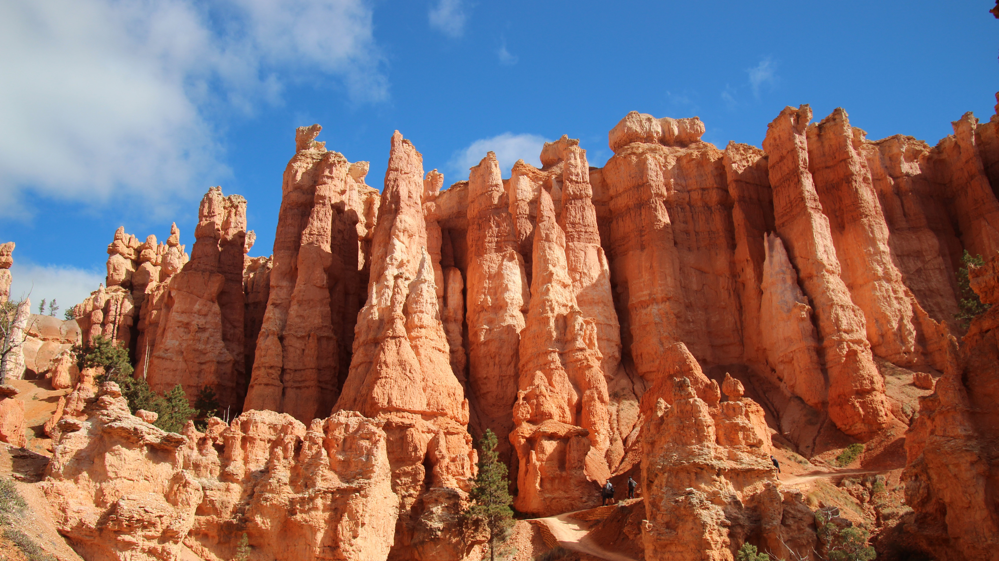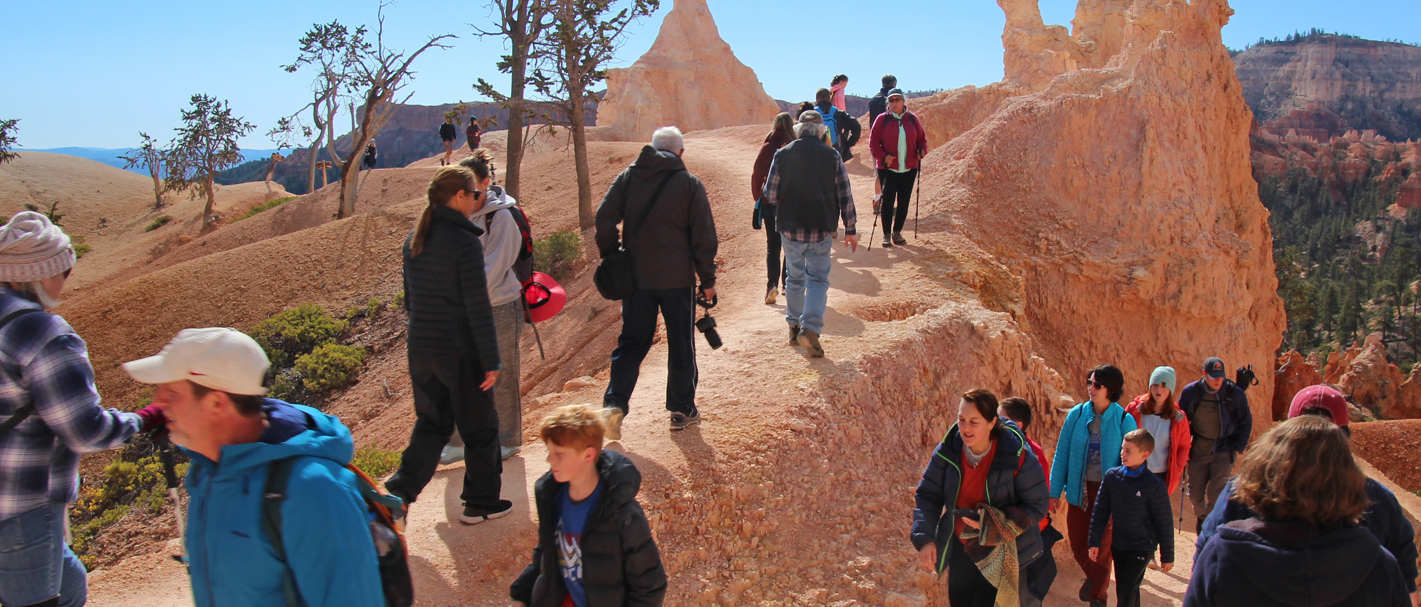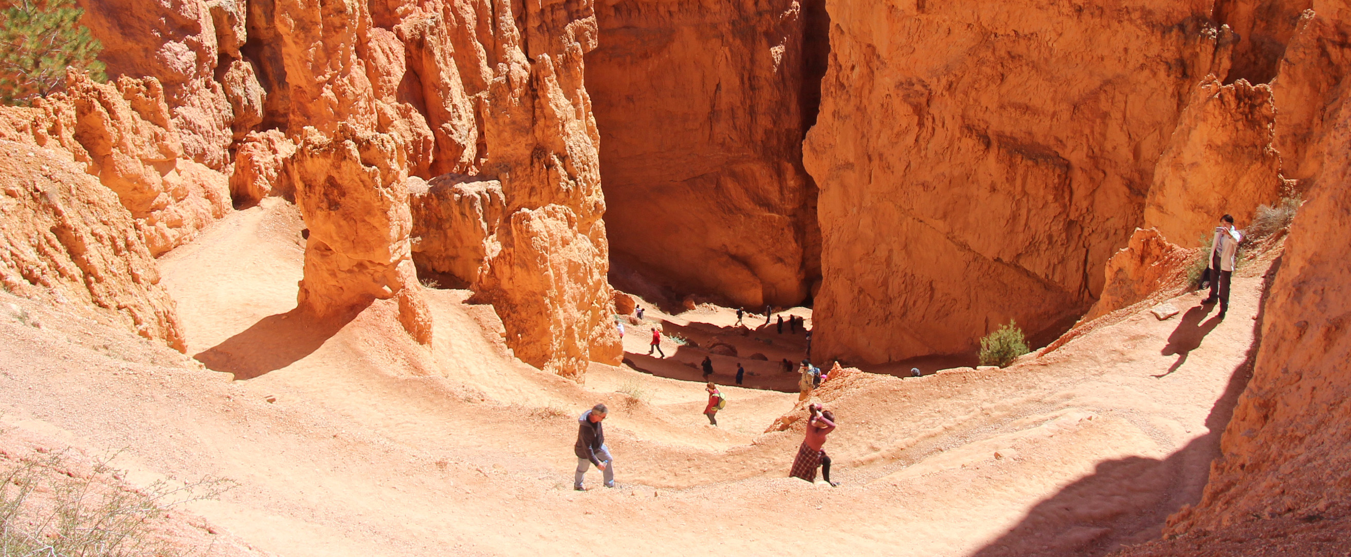 An otherworldly landscape that we experienced on a beautiful, crisp fall day. The day was perfect and the scenery was breathtaking – literally, since we were huffing and puffing our way along the 3 mile hike that dropped down about 600 feet at the 8,000 ft. elevation — and then back up again along some challenging switchbacks. You don’t want to miss the Wall Street section of the Queen’s Garden/Navajo Loop trail. The next day we left the area in a snowstorm that dropped about 6 inches of snow, so our day turned out to be the best chance for hiking.