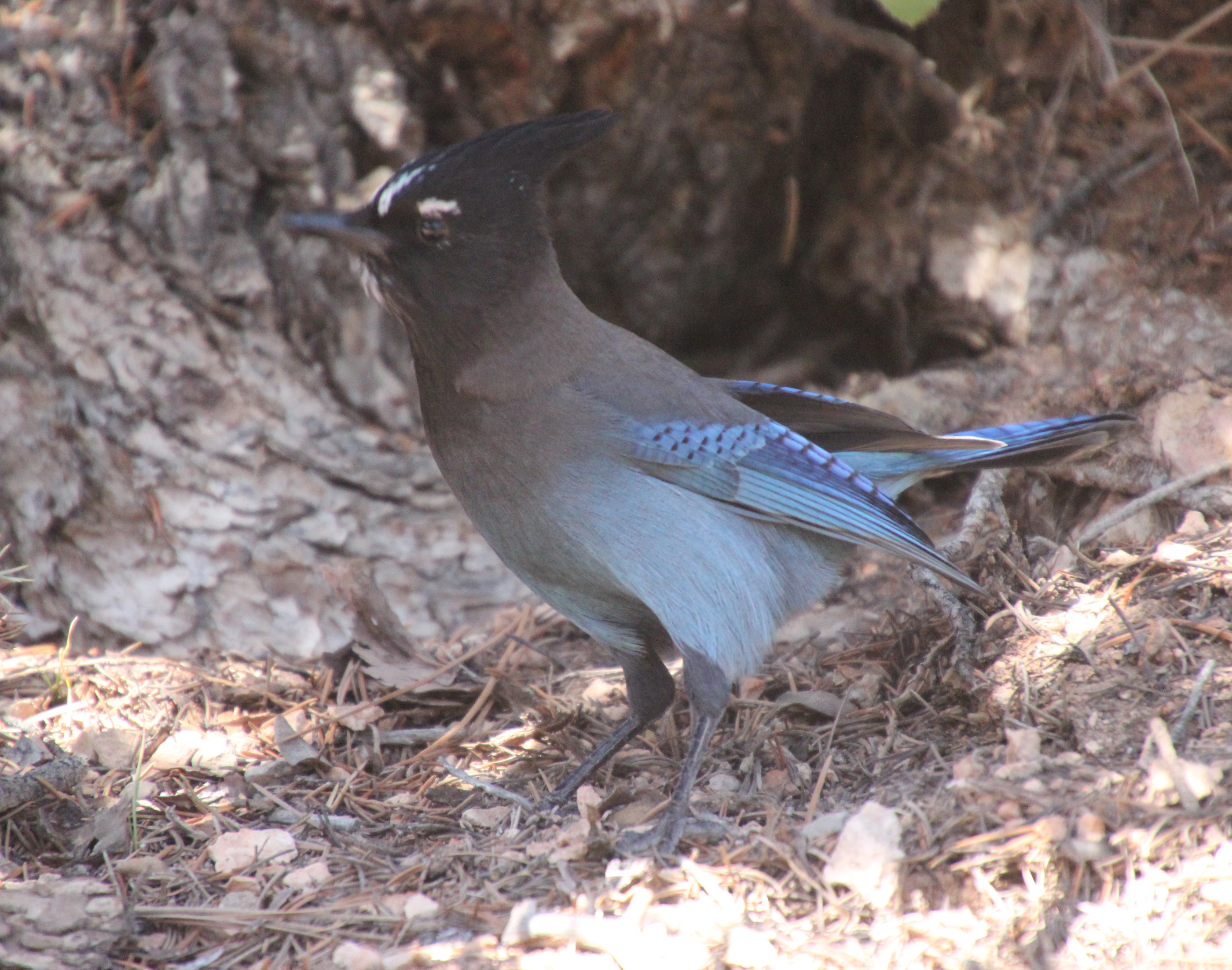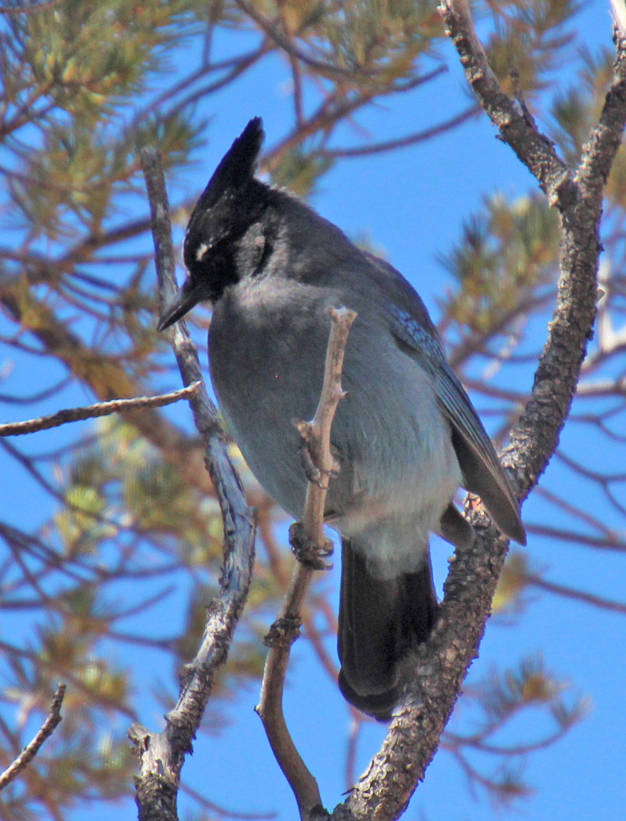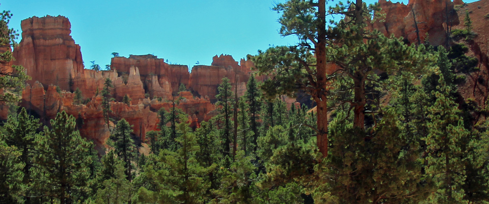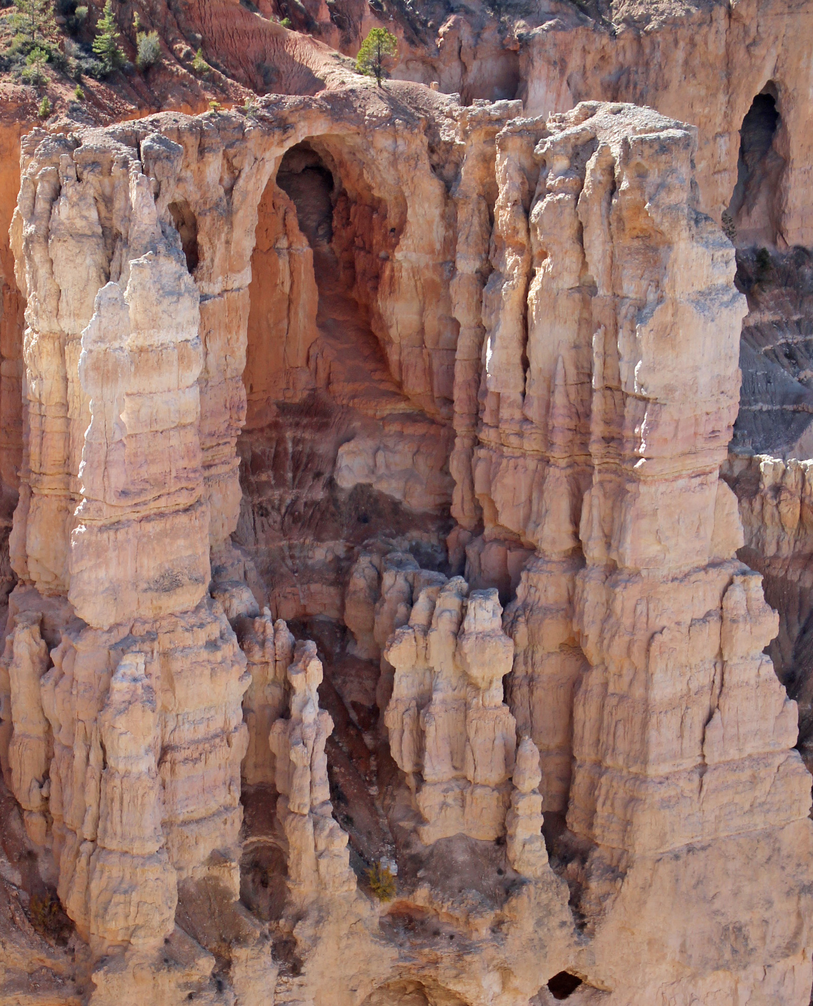 After a few tunnel passes and more meandering, we reached a much more wooded canyon and walked among the spruce, cedar and pine with chipmunks scattered about. There was a pinyon pine that had a couple of Steller’s jays bobbing around eating the pine nuts. Such dramatic blue and black birds. When we reached the end of the Queens Garden Trail we, along with many others, debated the way back. Map said we should link up with the Navajo Trail for a return trip of 1.7 miles, and not wanting to repeat ourselves we pressed on. Another junction offered two ways up: Two Bridges or Wall Street. Again, more debate among all of the hikers pausing there until Jackie declared “Wall Street” for us.