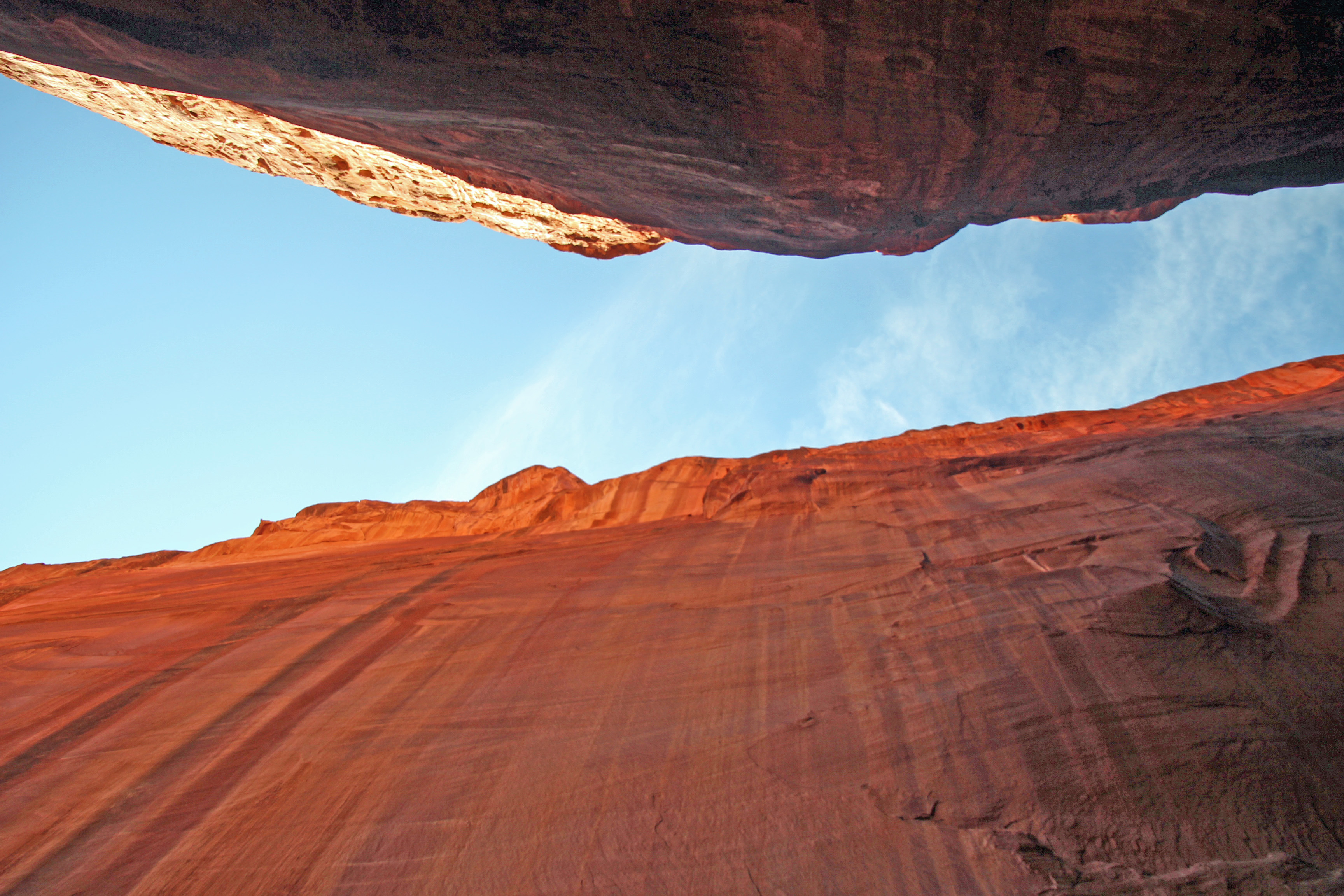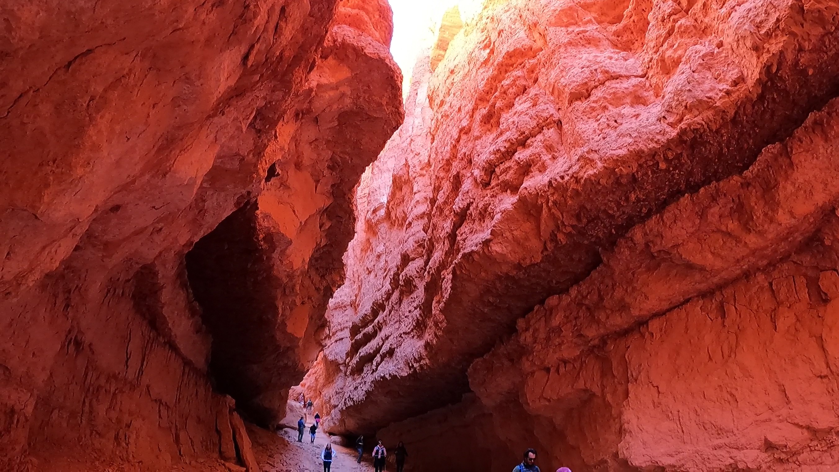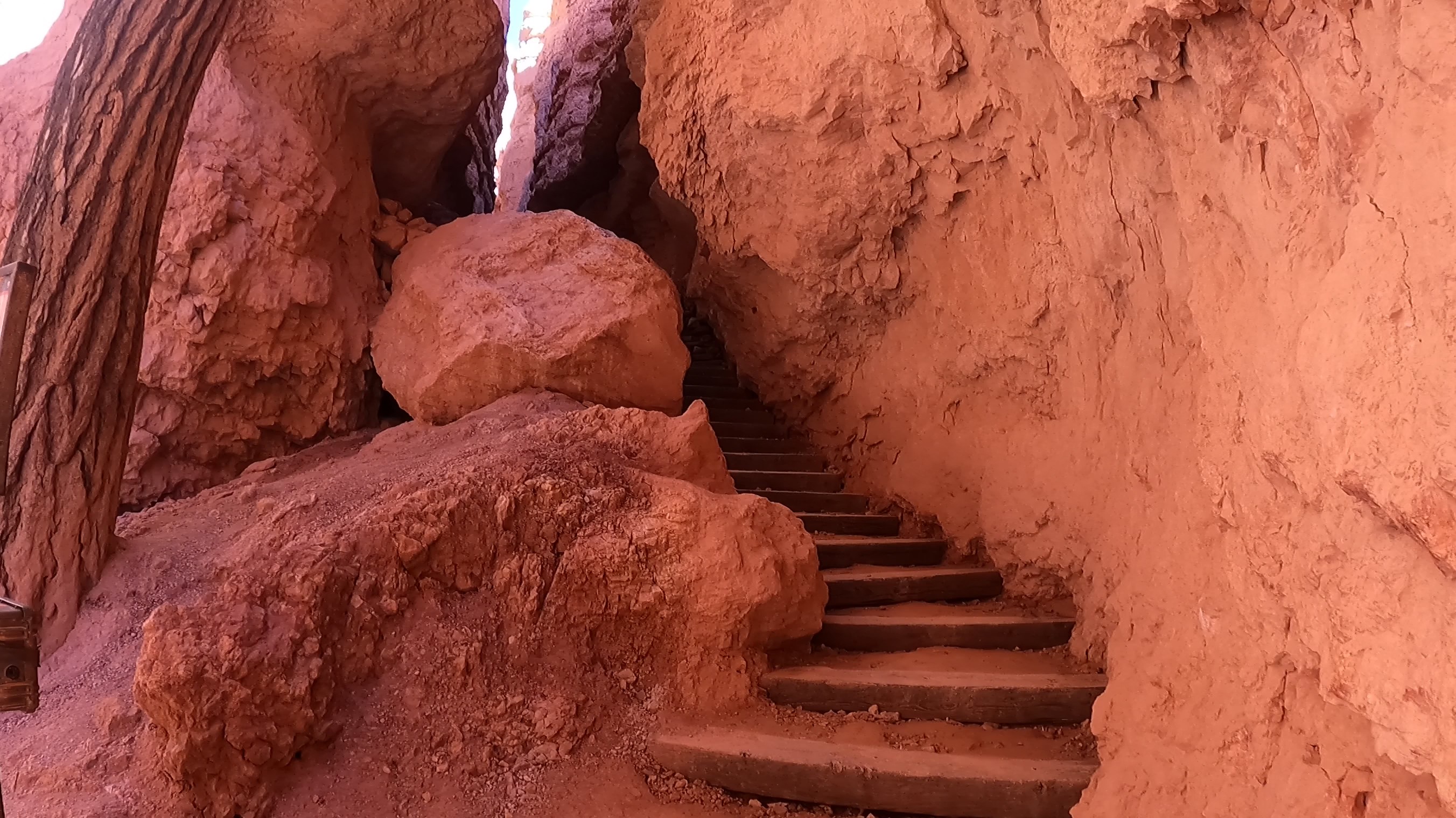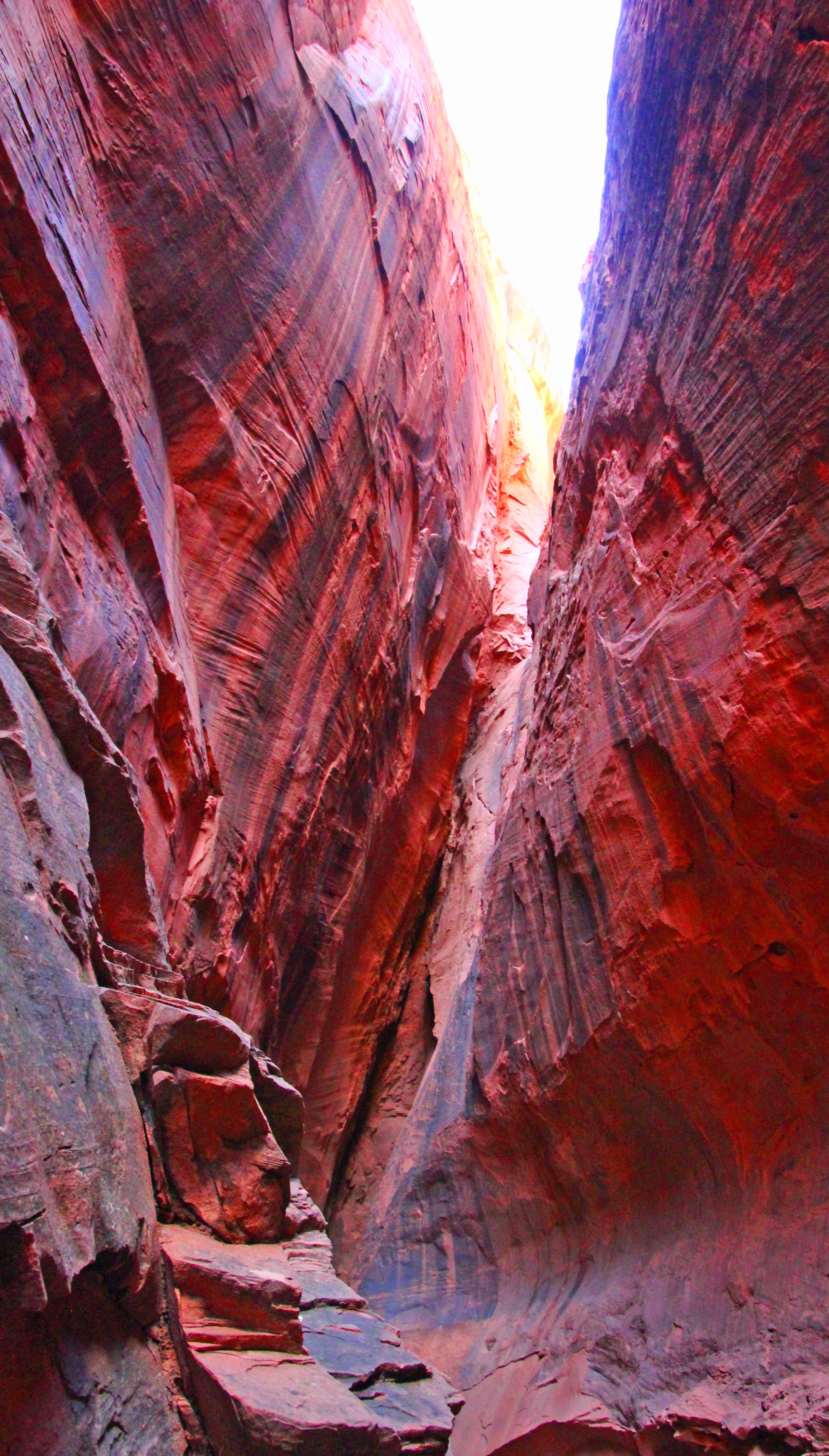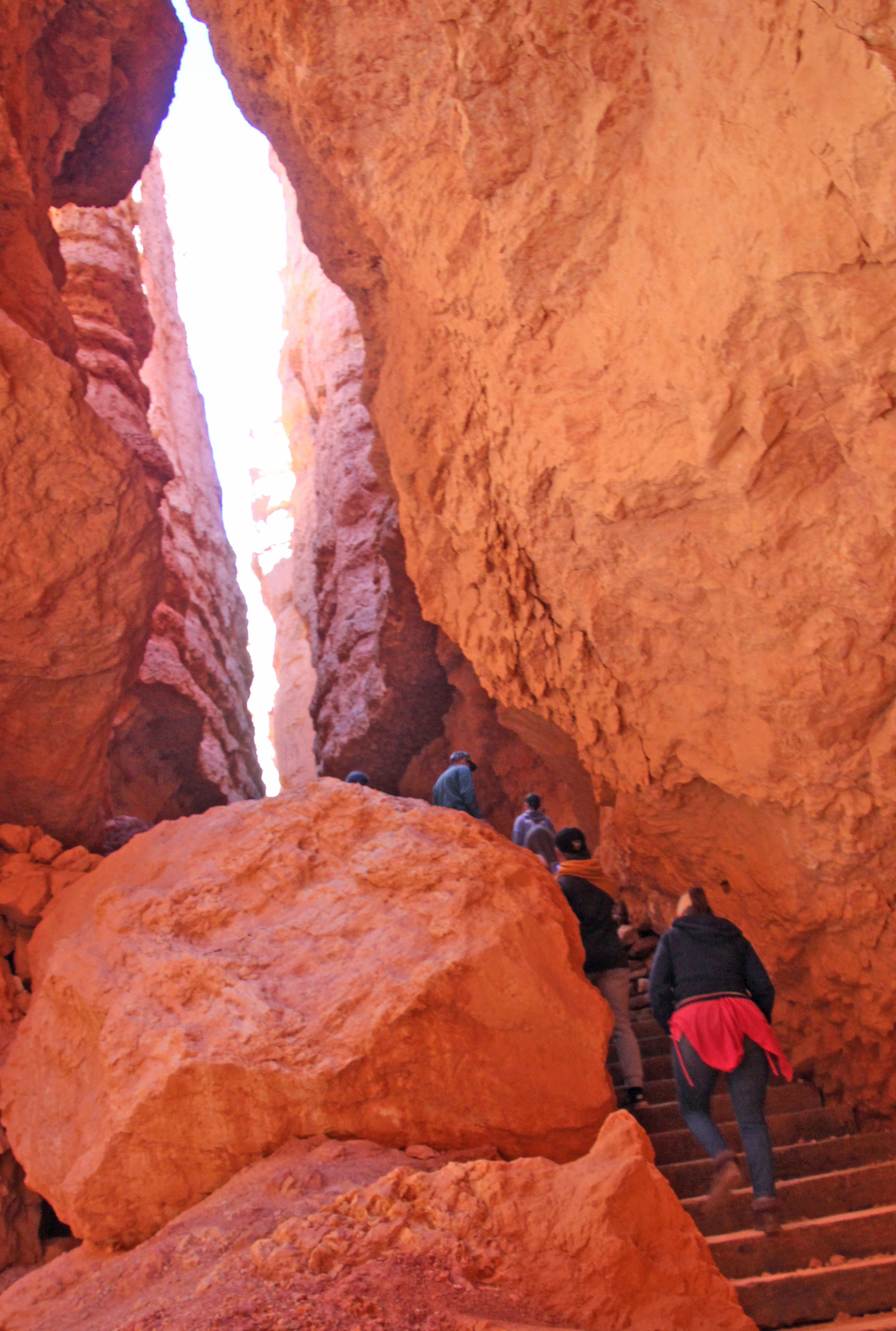 A challenge of an uphill hike until we hit the sweet spot. Crazy. There was a cautionary sign of falling rocks at the start of a stone stairway into a crevasse that really looked intriguiging. We let a larger family group go ahead of us and as we got to the top of the stairway we were speechless. We were standing in a huge slot canyon with sandstone walls that went hundreds of feet up above us. The air in the slight bowl at the base where we stood was rather cold but the experience was goose-bumpy anyway.