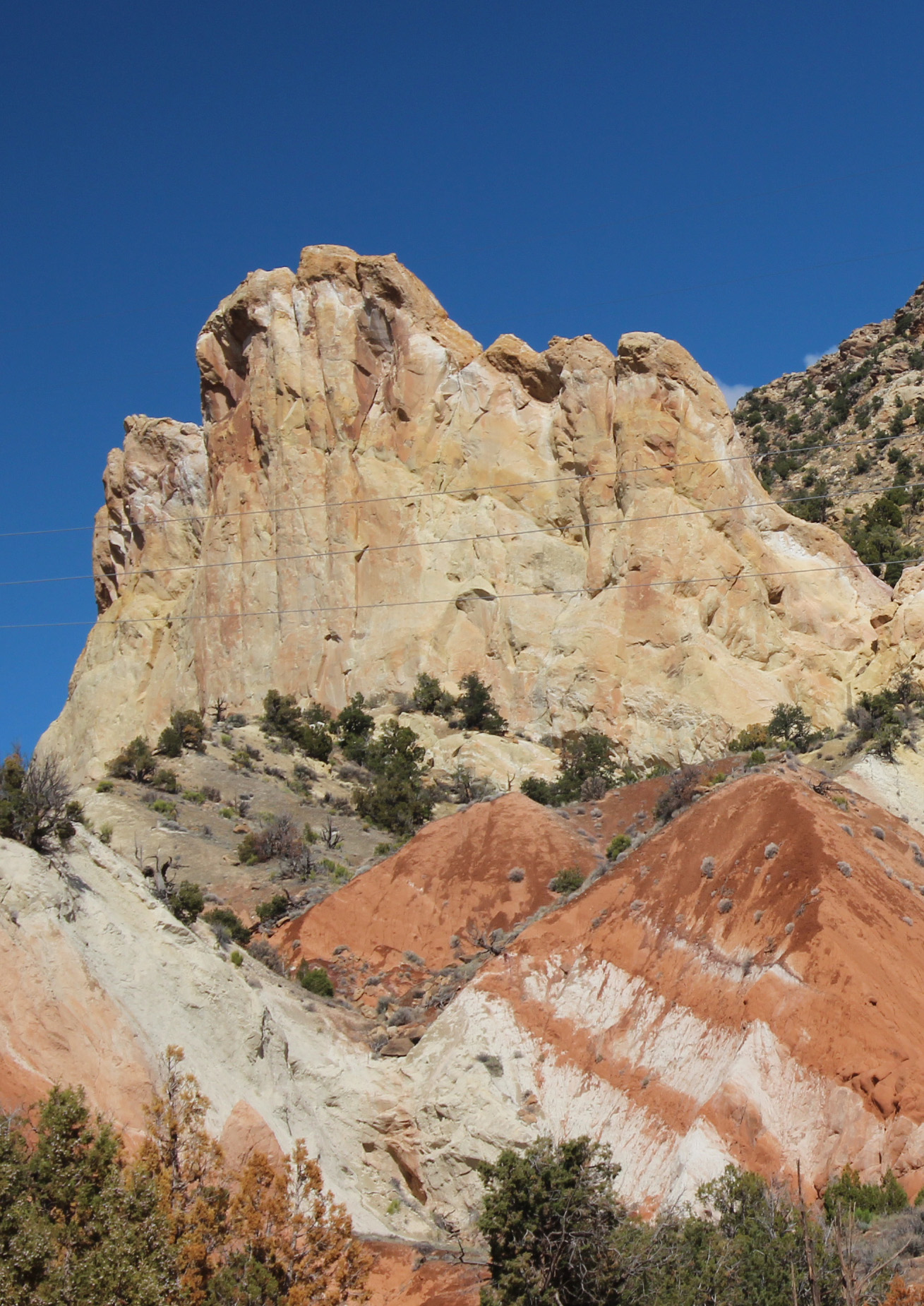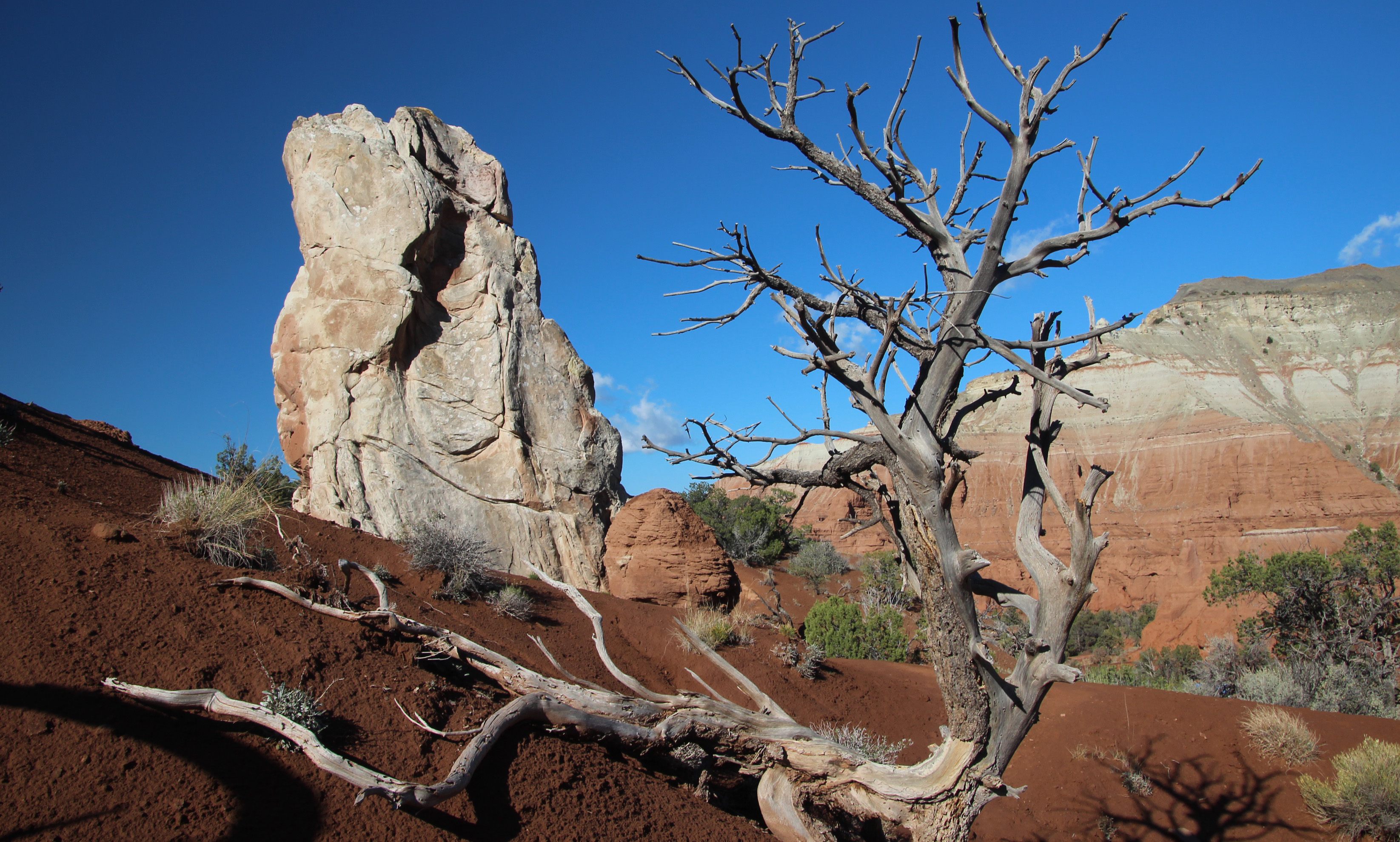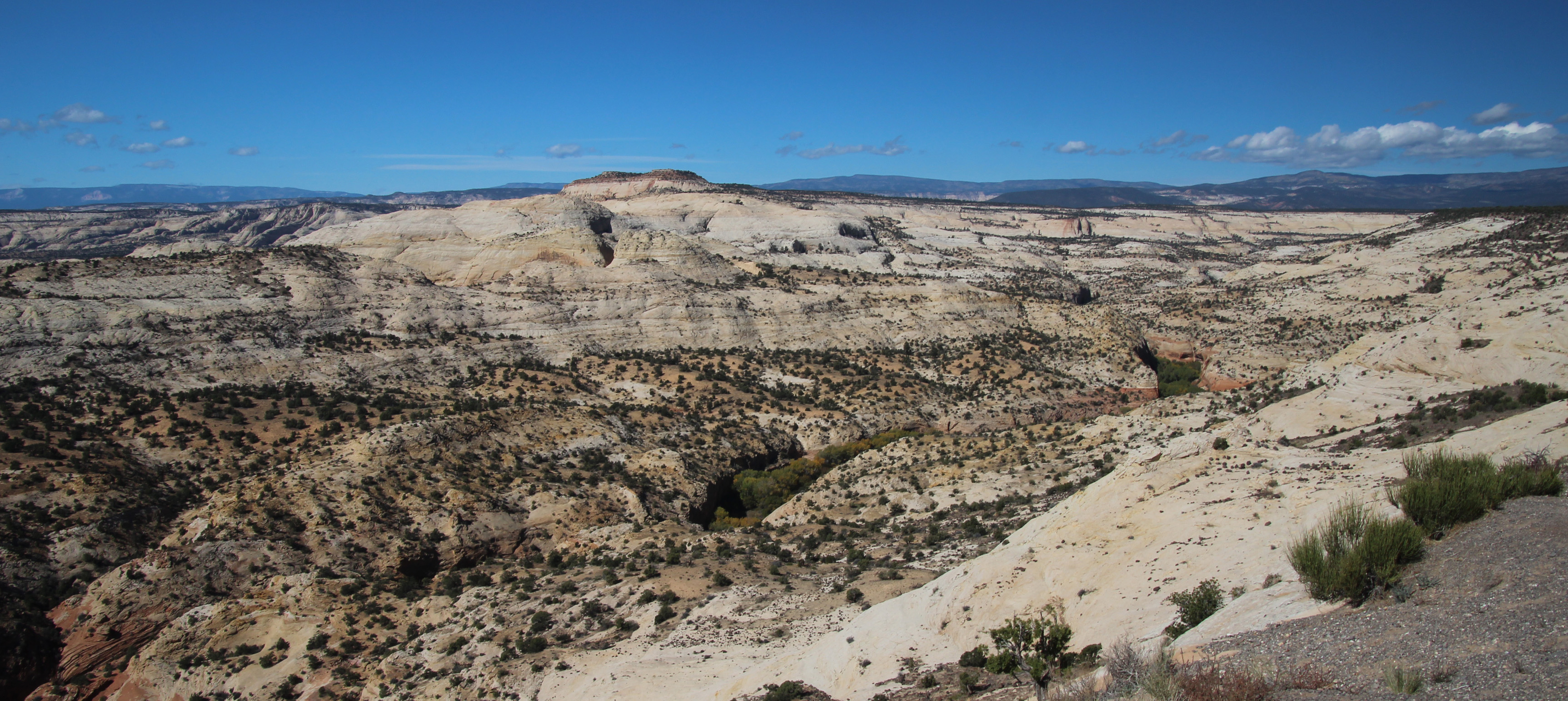 Lunch back in camp and we discussed the afternoon choices. Decided to drive 11 miles further south on a sand/dirt/washboard Cottonwood Canyon Road to see Grosvenor Arch, named for the original president of National Geographic Society and located in Grand Staircase/Escalante National Monument. Pretty amazing double arch of white sandstone that really popped in the afternoon sun. Walking from the parking lot toward the arch there were a couple of folks stopped halfway chatting on their phones. Somehow this spot in the middle of nowhere, a true cell-phone desert, they were able to get a signal right there. Ok, that was crazy.