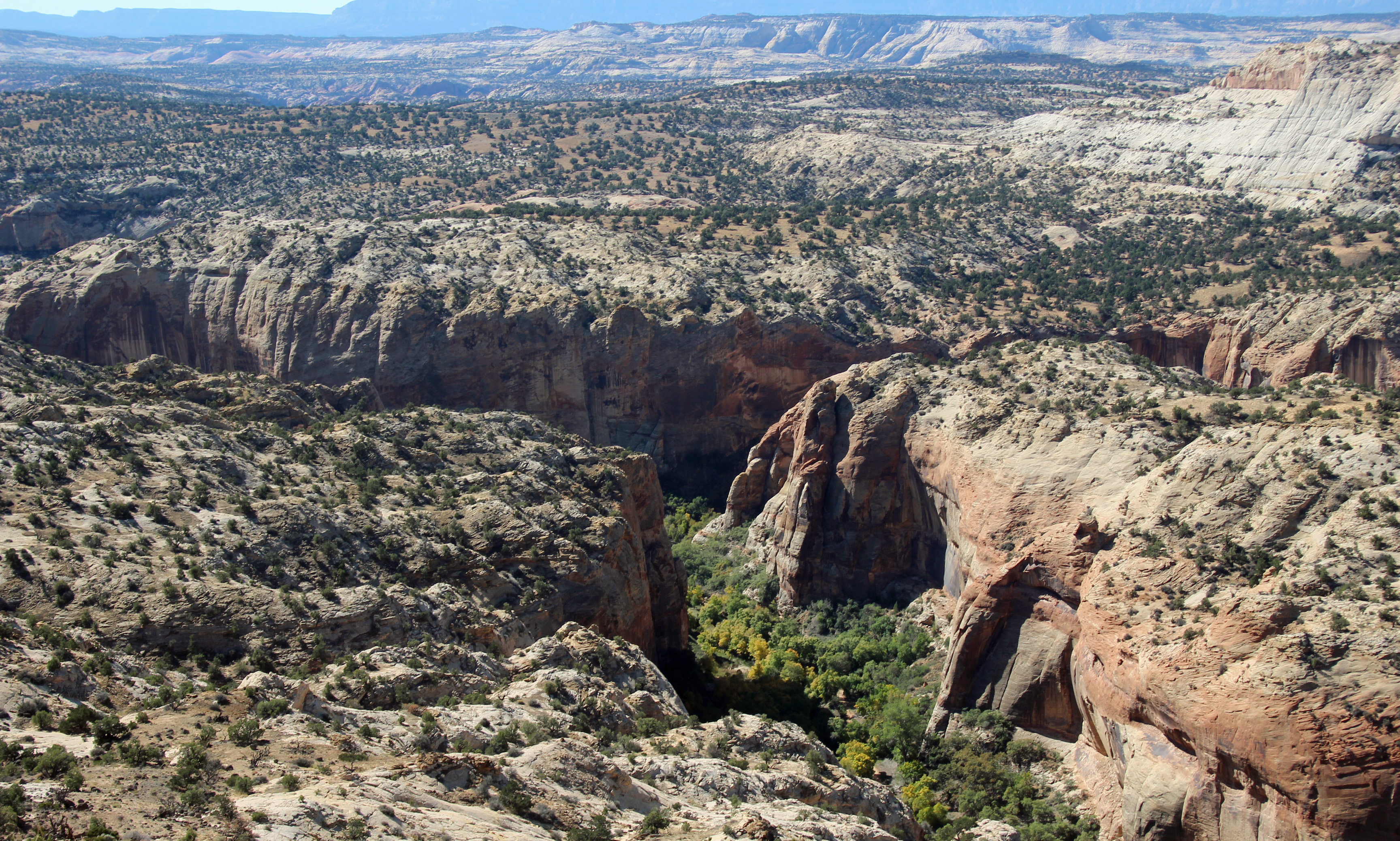 Studying our information closer, it looked as though the Burr Trail was a paved road at least as far as the slot canyon. It turns to gravel/dirt, but much further south. That’s good, because I wasn’t looking forward to 11 miles of washboard again. Soon we found the big cottonwood that stood outside the slot in the red rock and pulled over. Clearly a well-worn stop and the path was pretty obvious. Into the split in the rock we went, the cool breeze blowing outward. How perfectly wonderful! It was maybe only 100 yards in until you reached where the little gap let in only a dribble of water. But the sheer walls rose up hundreds of feet and echoed your voice around the space. Not surprisingly we were followed in by several other folks, but there was room for all and time for plenty of pictures.