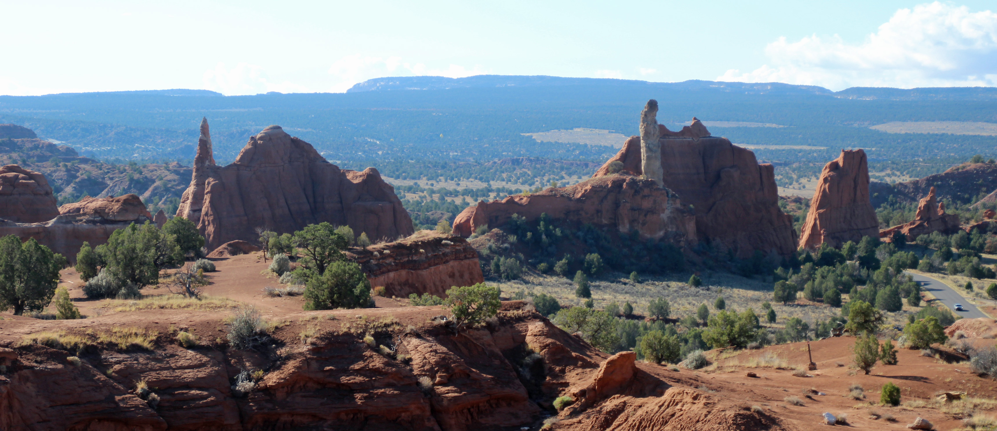 The trail followed several muddy washes up the canyon and opened up on red shale plateaus that were fun to wander. The park is filled with unique pipe structures that jut up out of the red sandstone. Hiking down the canyon wash that wall filled with cedars and pines you could smell the pinyon pine – a definite evergreen fragrance that was wonderful. Altogether it was a very cool morning.
