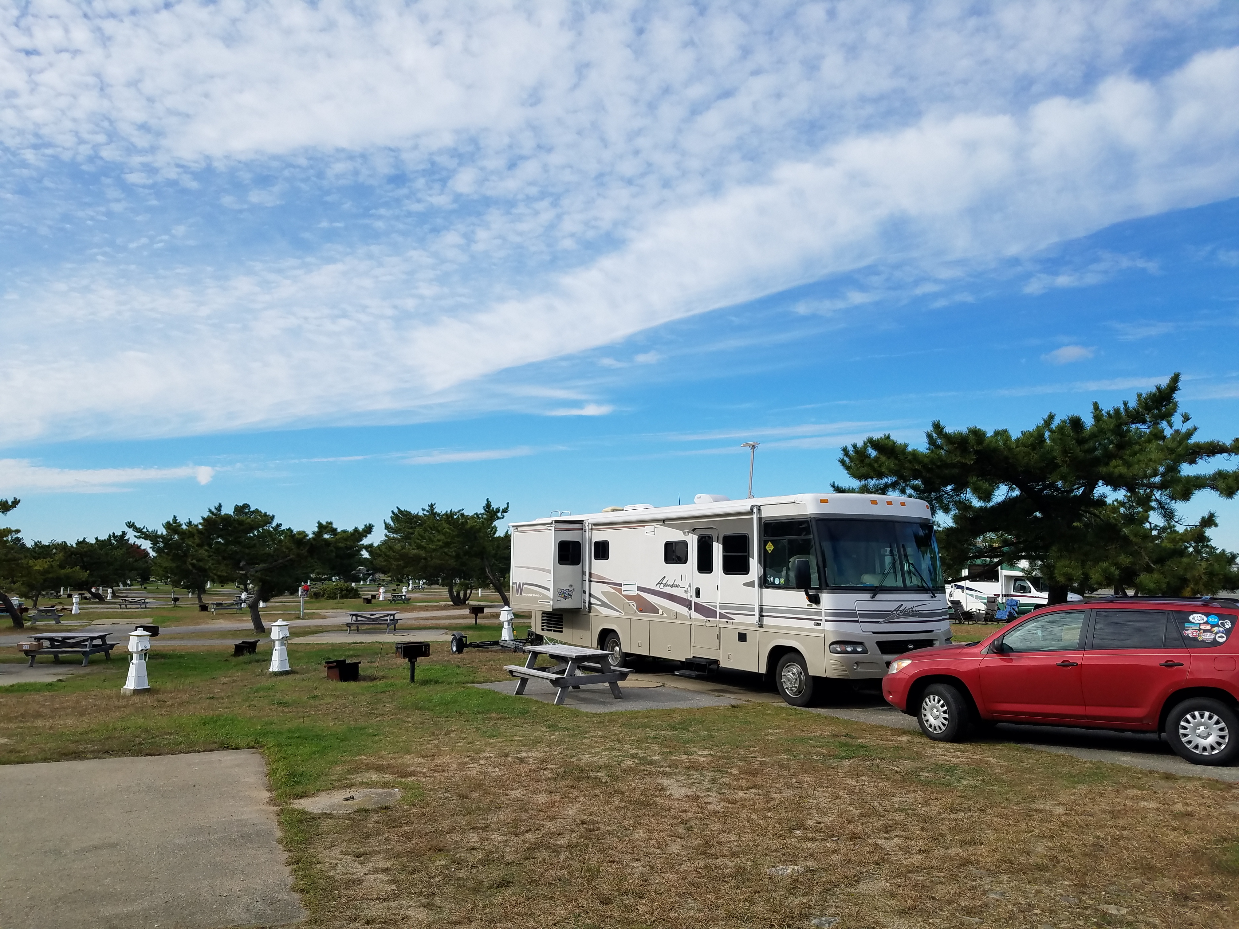 Another episode in our continuing adventure to see the fall colors in New England (and sample plenty of craft beer along the way). Yes, our wonderful site on the Salem harbor waterfront was really windy last night, so much so that we pulled in the slides to keep from rocking around. But not much rain and it was clear and chilly in the morning. Did the whole disconnect, hitch-up and head out routine on our way back through Salem and off to Rhode Island.