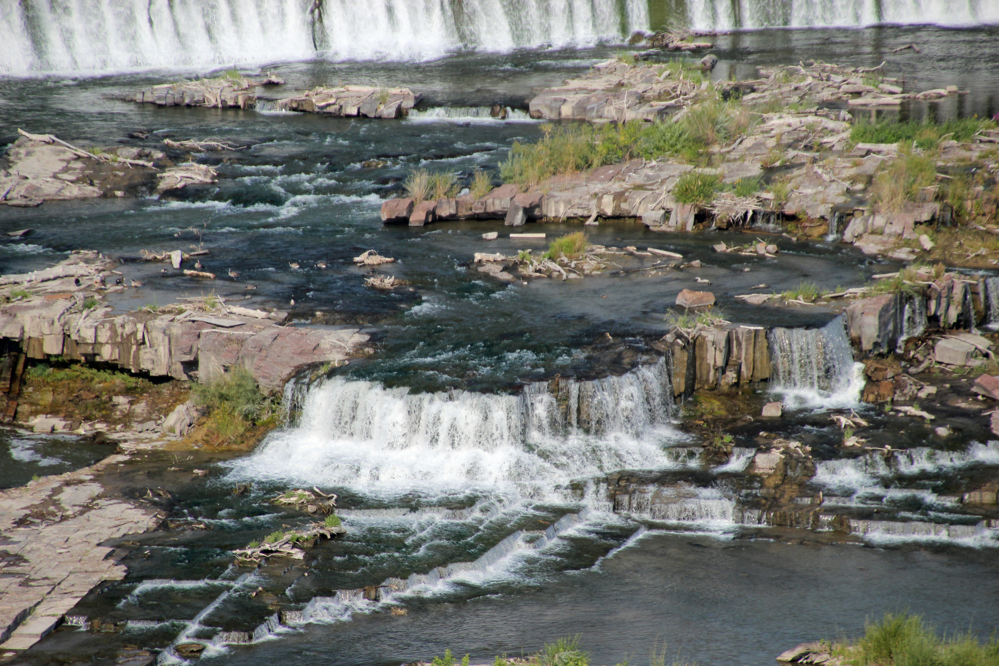 Down from our climb we continued west on the loop road through the jagged landscape. We spotted another herd of pronghorn and two large groups of bighorn sheep. Also caught a golden eagle circling overhead. The photo isn’t as crisp as I would like, but it sure does evoke the paintings of thunderbirds by the Native Americans. Probably the most entertaining were the several prairie dog villages we saw. At first you thought you were looking at large ant mounds in the grass, but soon noticed the critters pop out of their holes and whistle out a warning. Off they went to gather grasses and bring them back to the den, tails upright as they ran.