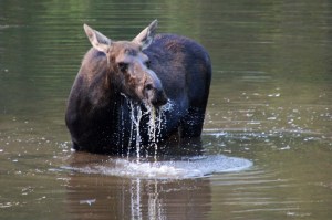 You may have read that a portion of the roadway into Denali was wiped away in a landslide of the soil and permafrost – actually, the road crossed a moving rock glacier. Replacing that section, which is less than halfway into the park, will be a couple of years to complete. That meant our trip was only about 6 hours, out and back. But that was plenty of time to see some caribou, brown bear, Dall sheep, golden eagles and ground squirrels. Moose not so much. Mt. Denali not so much either – it was hidden in clouds. Still, it was scenery that you won’t find anywhere else, as the glacier-scooped tundra valleys and sharp mountain peaks are spectacular. Fall was just starting to turn the leaves and grasses golden and red, a nice contrast with the green spruce. In a case of the movie Endless Summer’s line “you should have seen the waves yesterday,” Norm and Carol confessed that on their first day in the park (while we were on the train) they actually had a moose cross the road in front of them. Norm supplied the photo as proof. Darn!