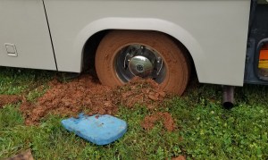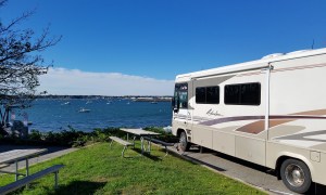 Maybe an hour after we hit the sack our awning suddenly started blowing up and down with much thumping. That’s not a good sign, so I jumped out of bed to roll it back in, while the wind was whipping up and thunder could be heard in the distance. As lightning flashed and the wind blew, we folded up chairs and caught the rug before it blew away, also keeping an eye on the screen room (which we had fortunately staked to the ground). It wasn’t long before we were pelted with big raindrops and retreated back to bed, this time with Kodi joining us of course. Big booms of thunder cracked and echoed around the mountains and valleys as the rain continued to fall. Not a restful first night.