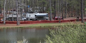 Back at John’s we had some work to do. Judy and Craig had to drive back to pick up Rachel, then return to hitch up and head back to Nashville. While the weather was good, Doug and John trenched and built footing forms for the cement that would be poured for the garage floor later in the week. There was a pile of scrap lumber that had to be moved and a very large tarp under the deck that had to be dragged around front, cut up and taken to the dump. We installed a large light fixture that hung from the ceiling above the kitchen island and wired up and installed the ceiling fan over the living room.