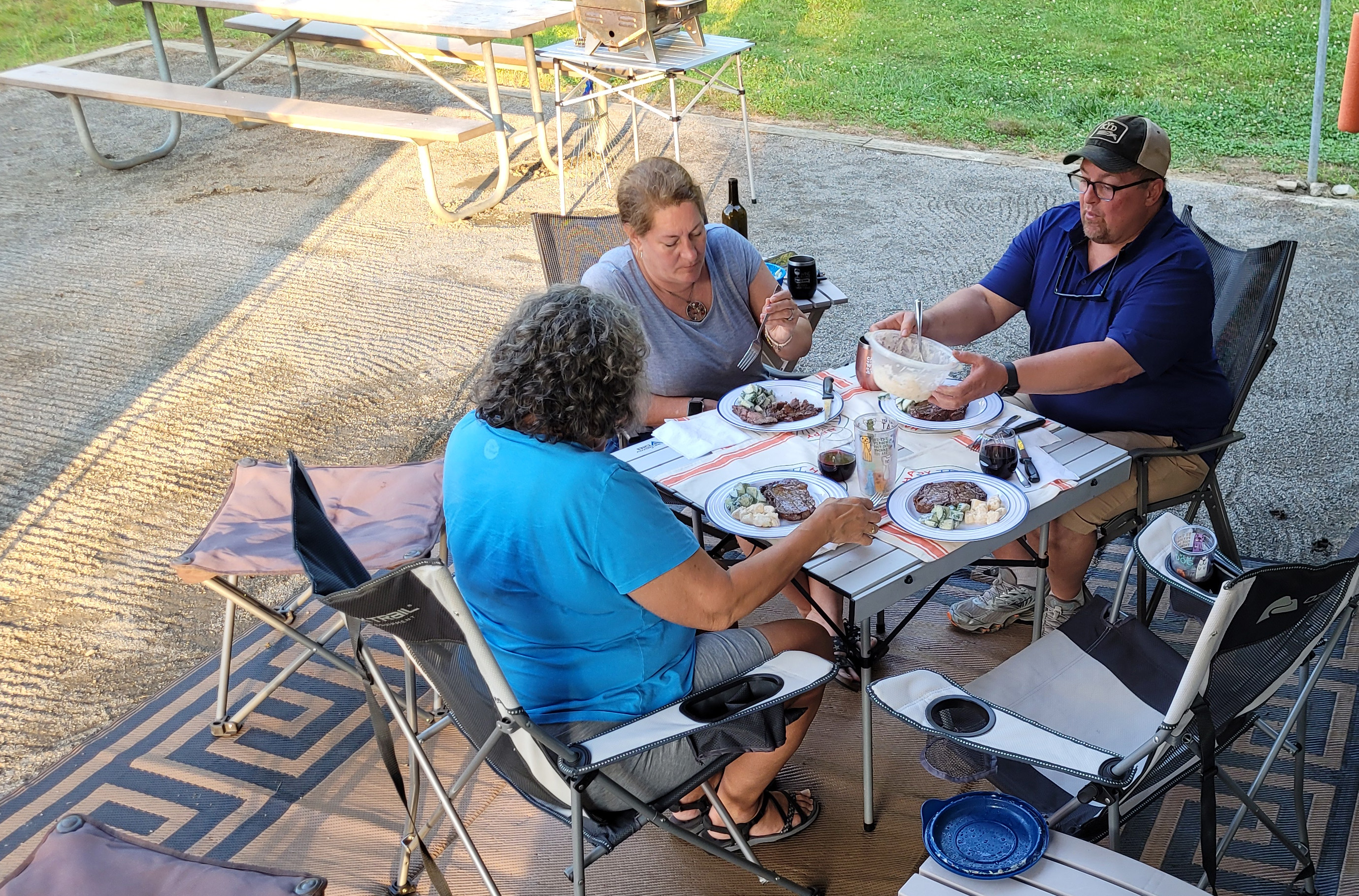 Judy and Craig told of how long the check-in process at Camp Cheerio was that morning, but Rachel was properly settled in for the week, son Colin was out in New Mexico working as troop leader for the Philmont Boy Scout Ranch and now it was just the four of us camping. As the wine ran out we got hungry and headed back to cook dinner and watch the stars.