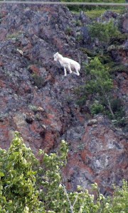 The big day began with our 3-hour drive to Seward along Turnagain Arm (the big bay).  There was almost nobody on the road as we wound around the cliffs and along the rocky shore.  All eyes were on the water for whales, but Vicki suddenly blurted out that she saw something on the rocky cliff.  Off to the shoulder and out of the car, binoculars scanning.  Soon we found the Dall sheep that she spotted, way up on the hillside.  A little further on we stopped at Bird Point to scan the water again, but the excitement was back on the hillside again.  This time there were young Dall sheep among the adults, and not far above us looking down.  Good spotting.