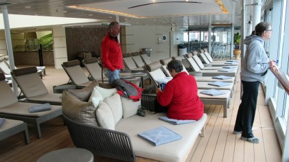 The next morning was embarkation day and it started with another delicious breakfast at the hotel.  We took the town’s free shuttle to the pier and waited for boarding instructions.  It was a dreary, colder and rainy morning, not at all like the gorgeous day before. Fairly soon we had our ship credentials and were headed across a windy, rainy dock to walk up the ramp and onboard the Celebrity Millennium.  Cheers! We were handed glasses of champagne and noticed that we were the first four people aboard.  Ok then, let’s find a cool spot to hang out.  Pool bar was open and not at all busy.  The crew looked like they were fishing in the pool with their yellow slickers and nets – really?