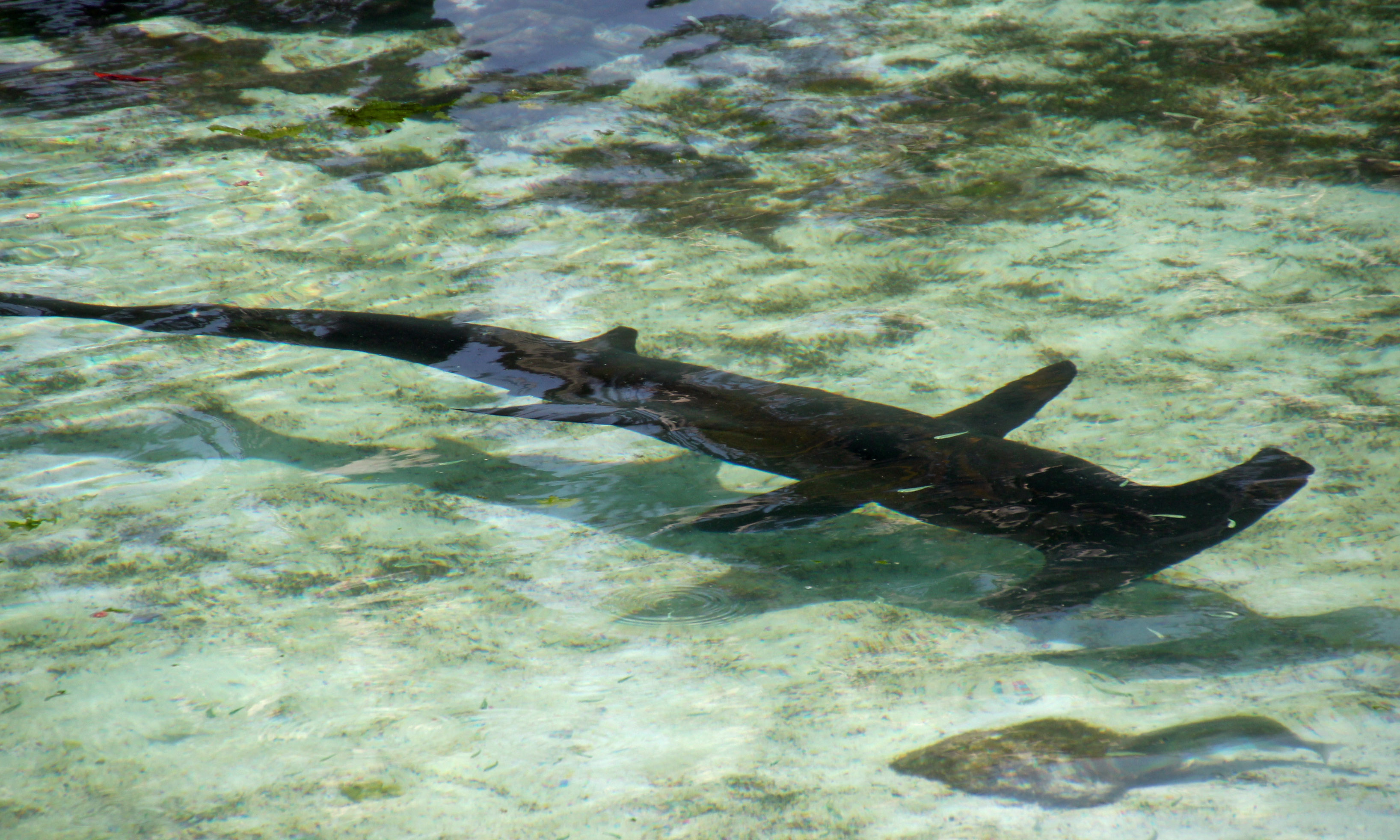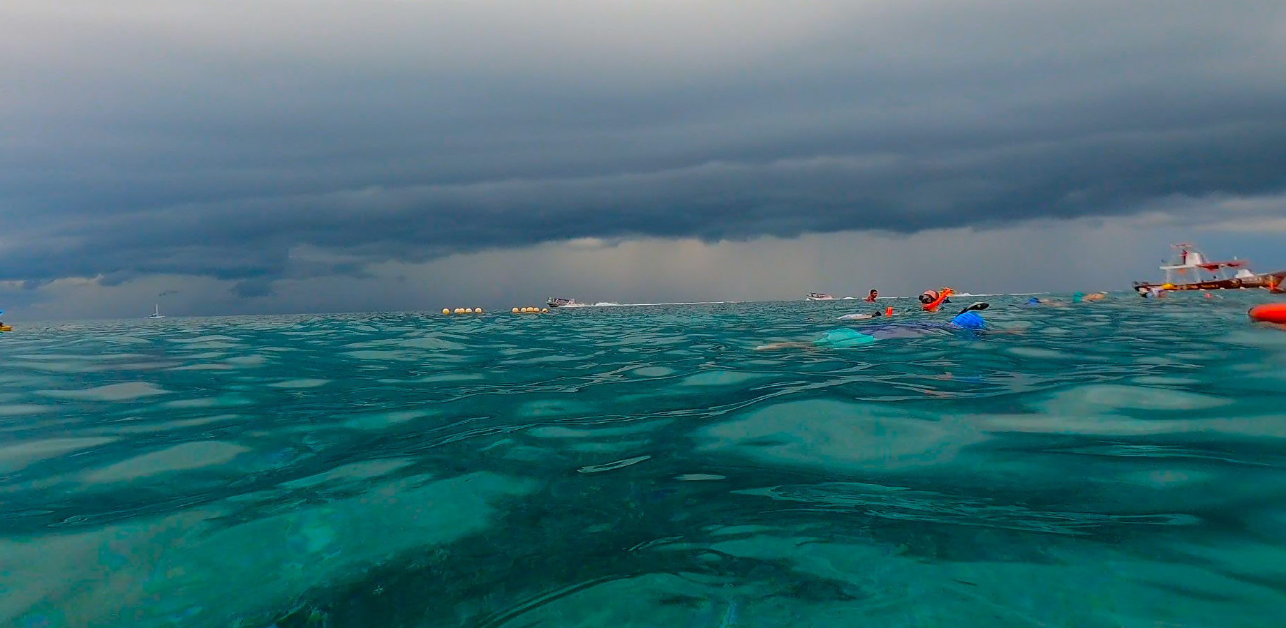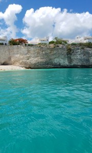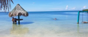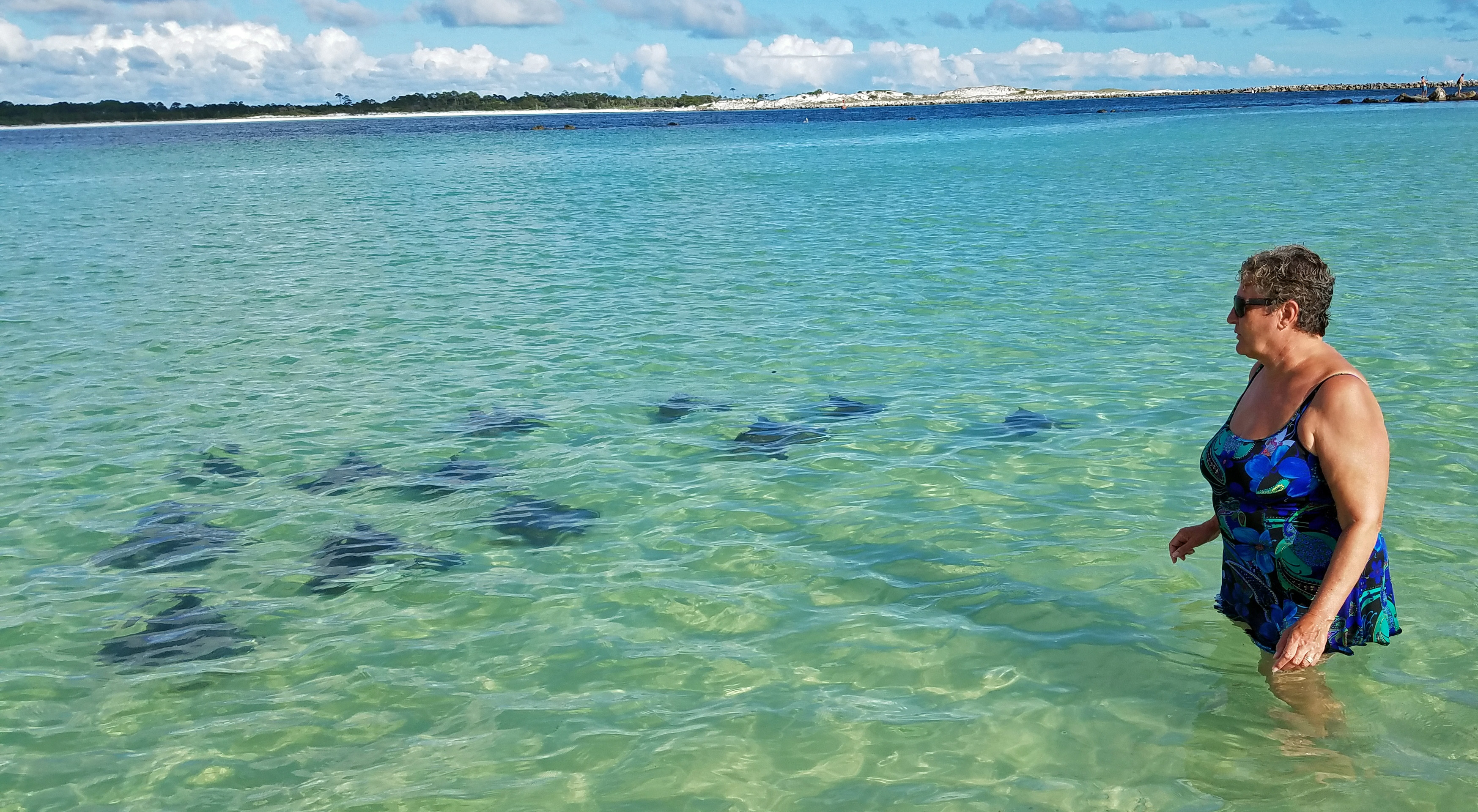 Back at the beach landing we changed into our snorkel gear to check out the sea life. Turns out it was pretty stirred up and hard to see clearly, so we opted to slip off our fins and get out. As we were doing so, someone pointed out “octopus in the water”. Sure enough, there in the wave wash was a dark grey/purple octopus, maybe 12” across the spread tentacles. We watched a bit before it disappeared deeper into the water. How very exciting!